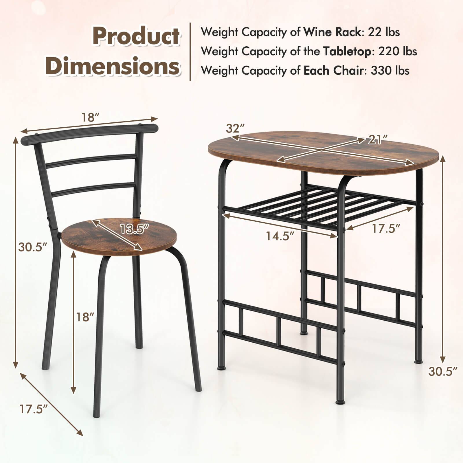 This question and answer was generated by AI based on customer and product data.QuestionWhat are the dimensions of the table and chairs?