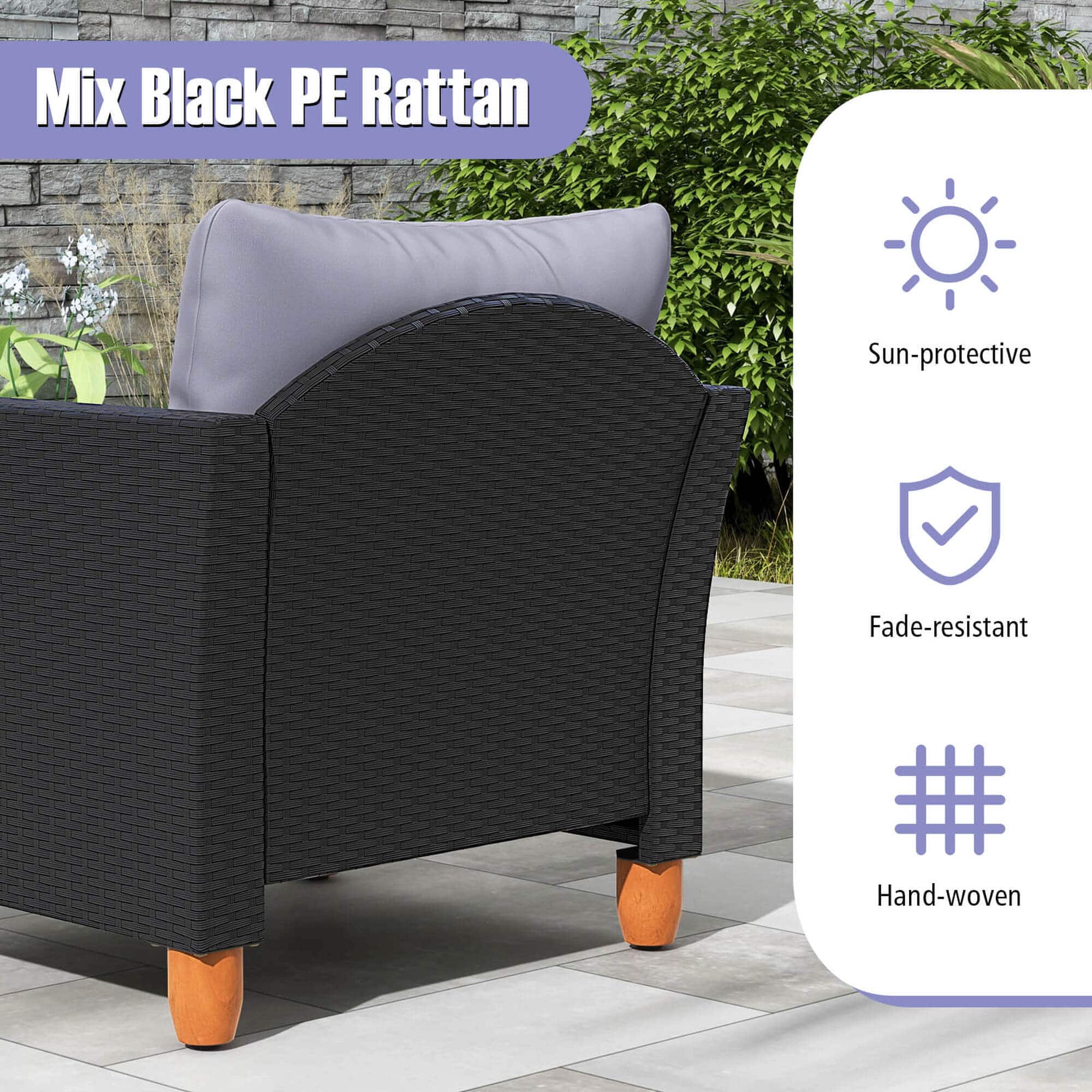- A:Answer This patio furniture set is made with colorfast hand-woven PE wicker, a rustproof metal frame, and solid acacia wood.