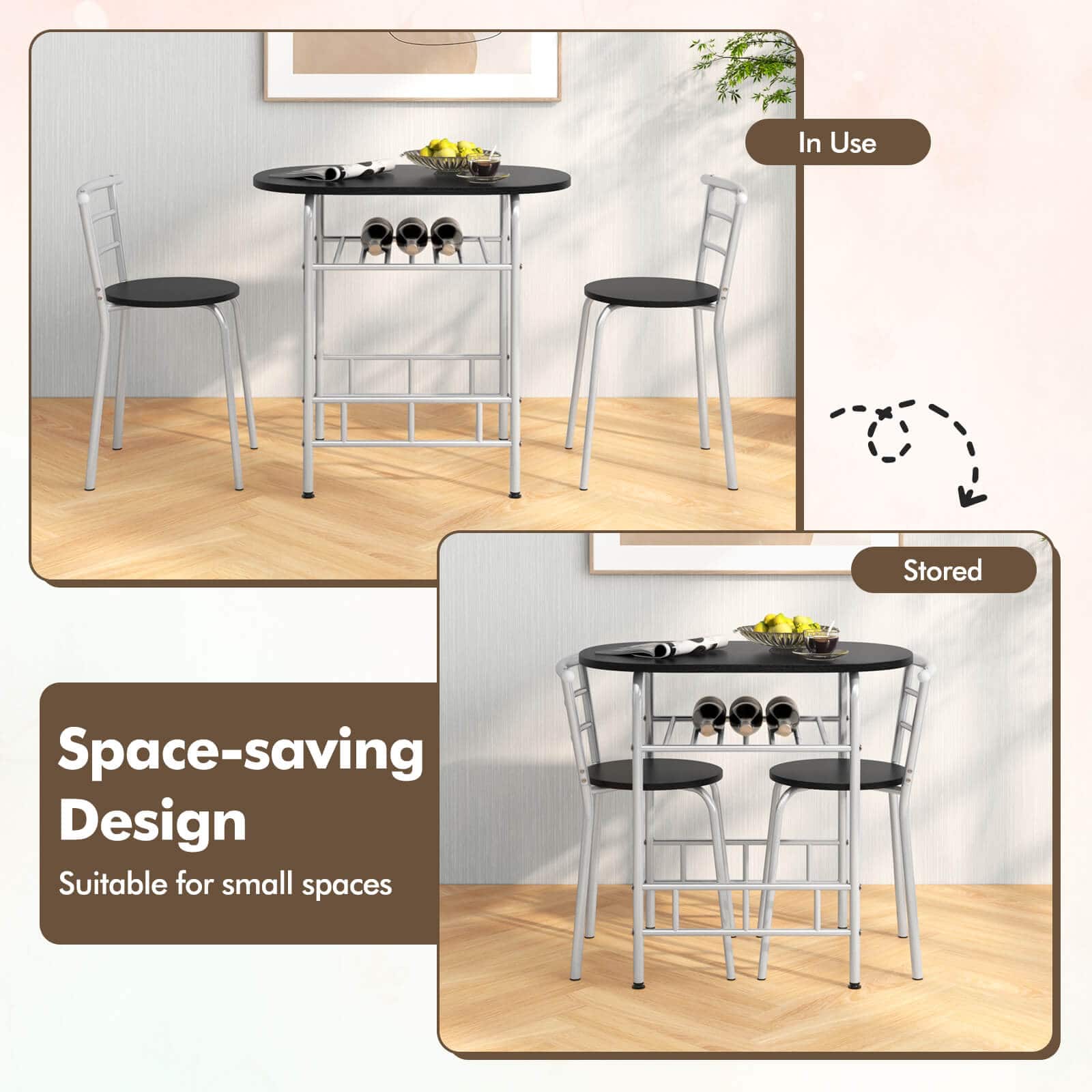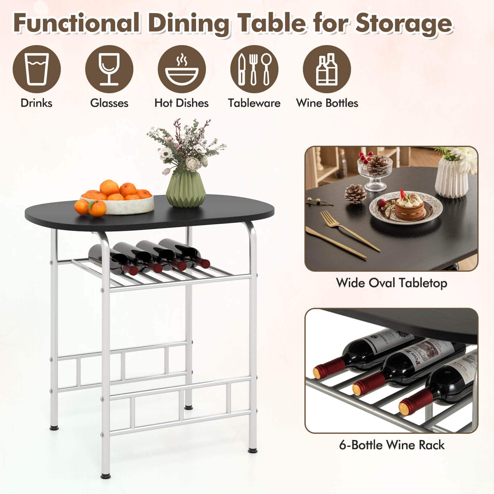 - A:Answer The table features a wine rack located under the tabletop.