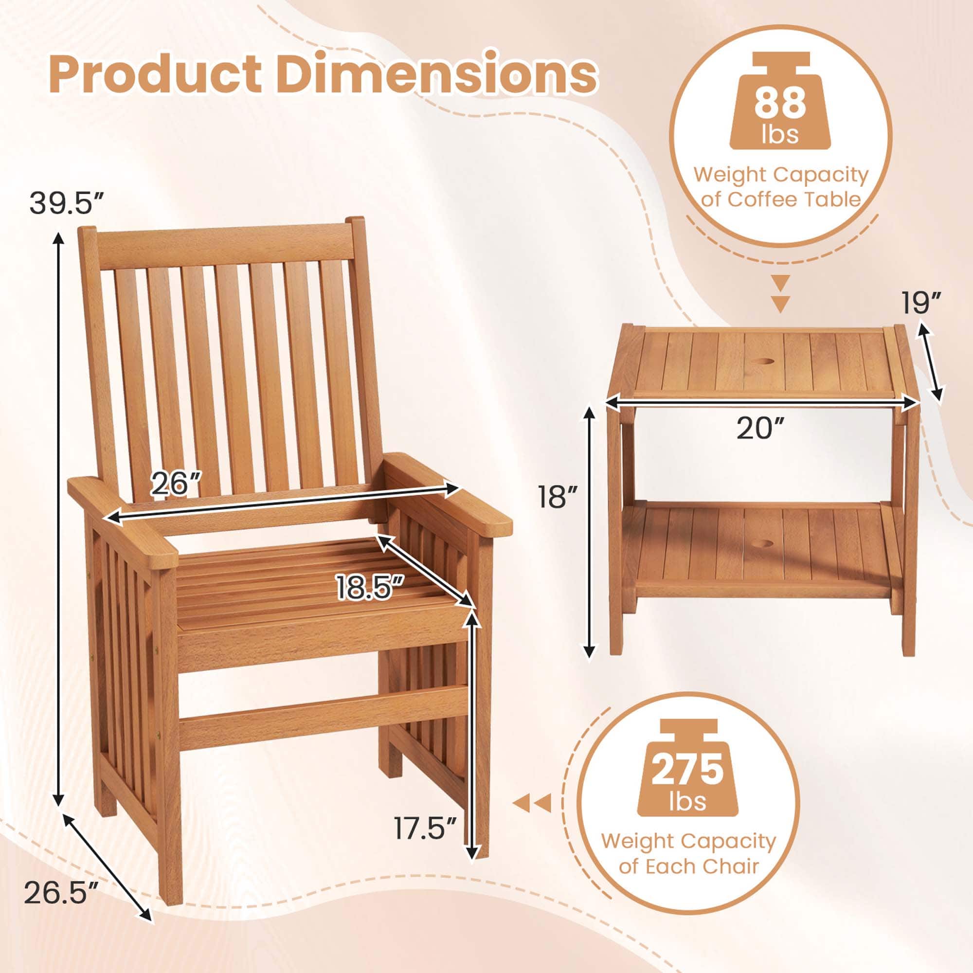- A:Answer Each chair in the patio furniture set has a maximum weight capacity of 275 pounds.
