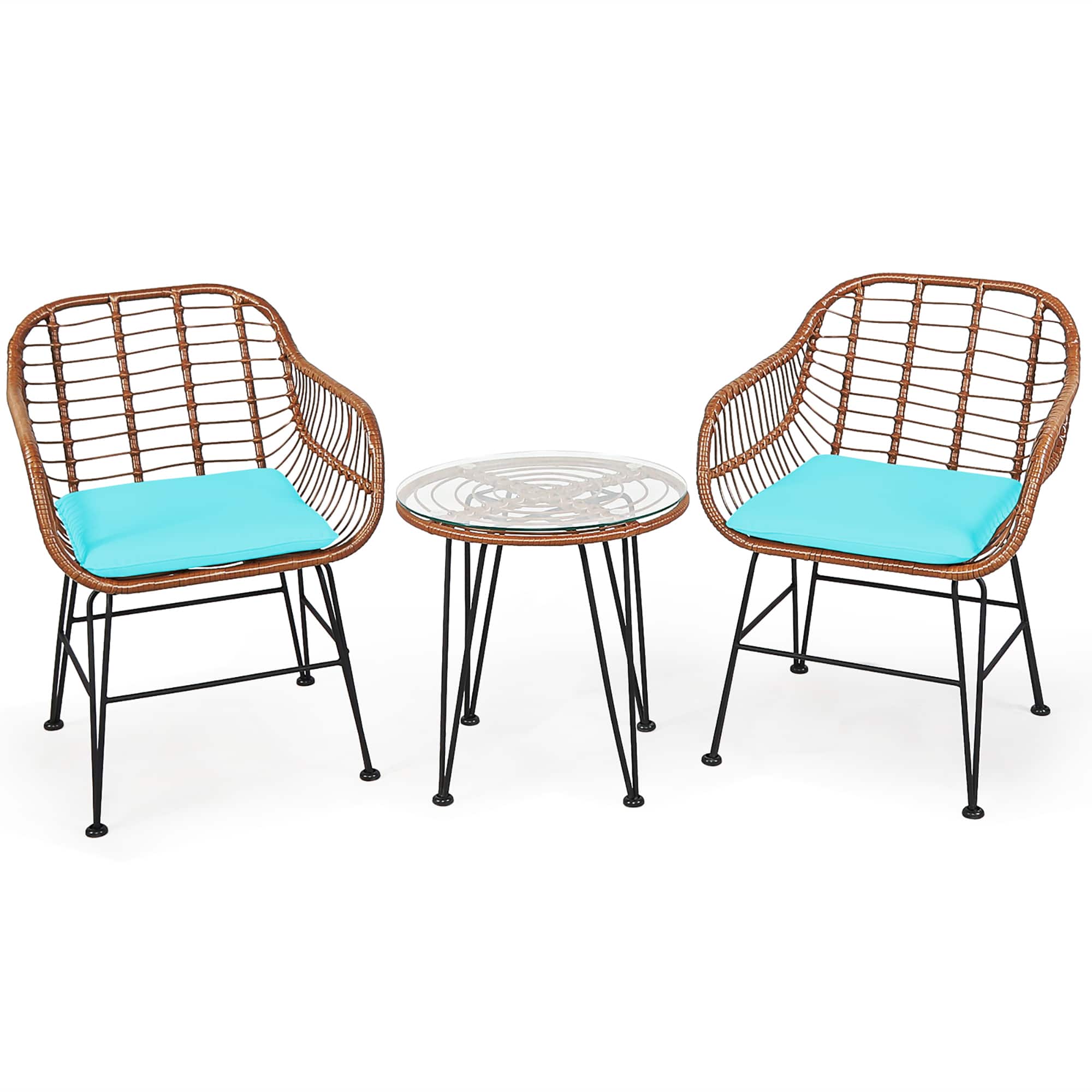 - A:Answer This bistro set includes 3 pieces: 2 armchairs and 1 circular side table.