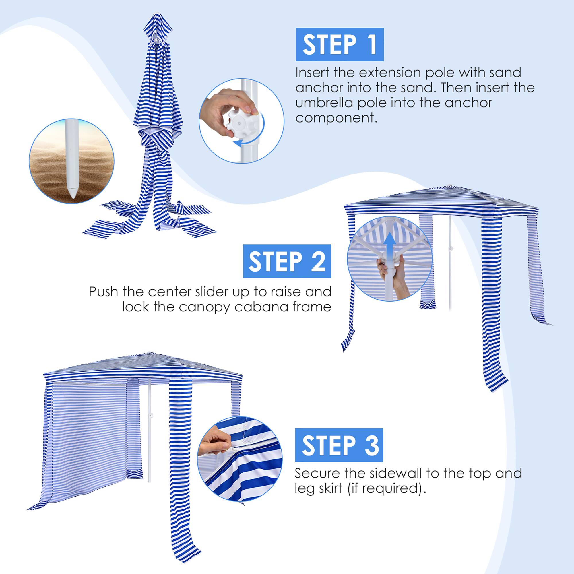 - A:Answer The beach cabana can be set up on various surfaces like sand, grass, or even in your backyard as a pool cabana.