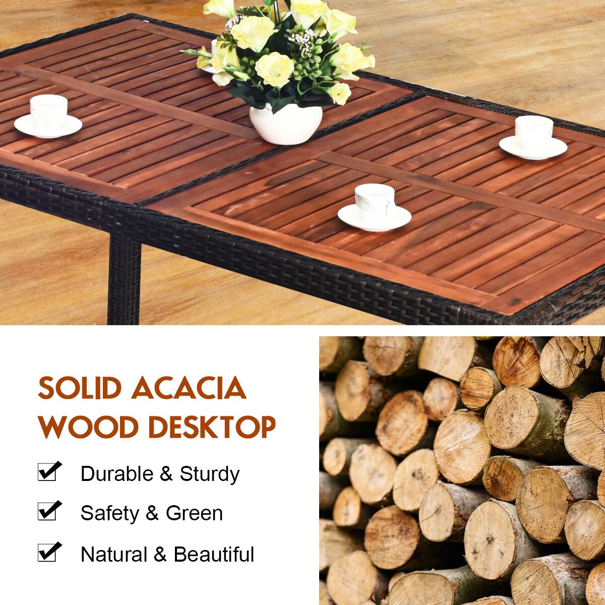 - A:Answer The dining table is equipped with an acacia wood top.