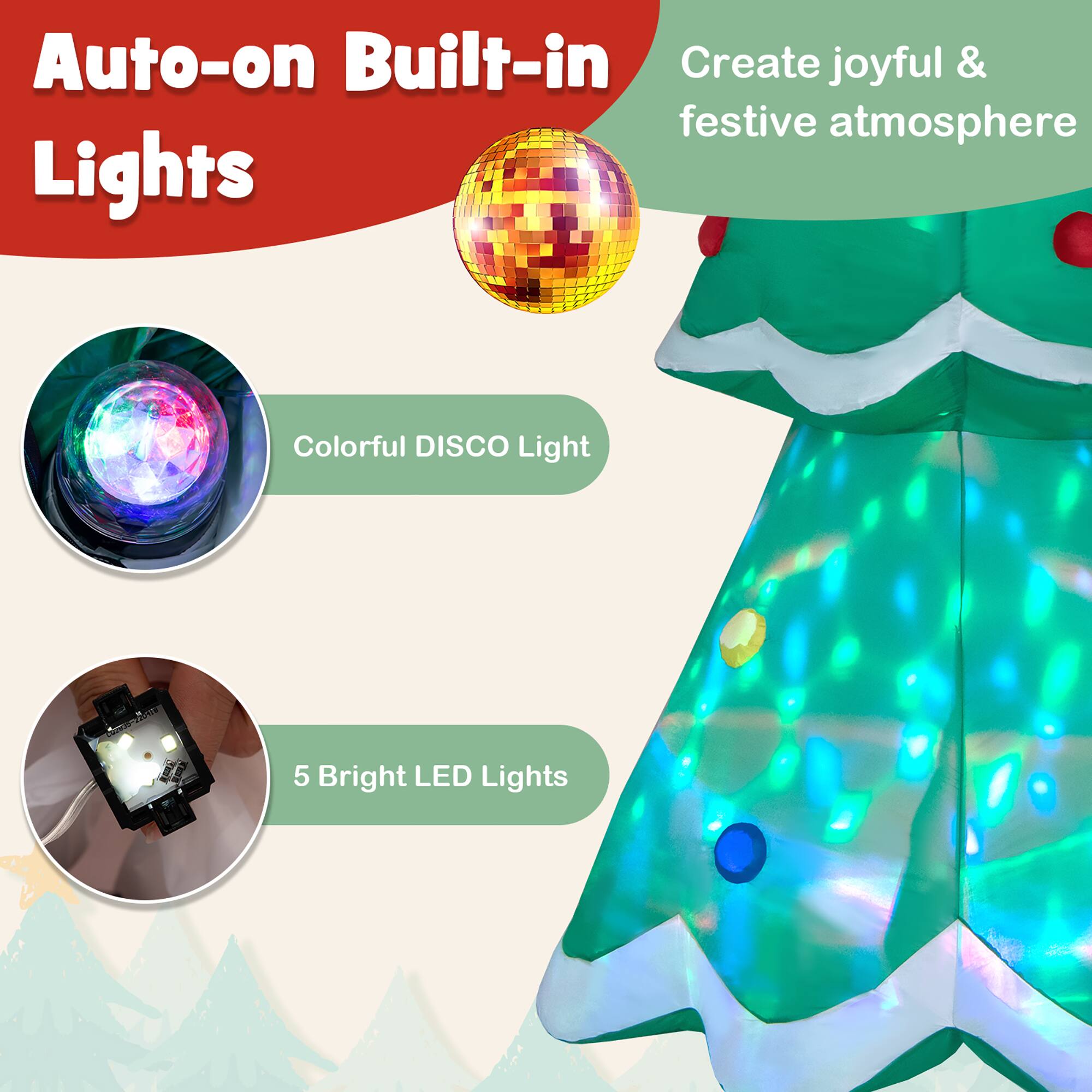 - A:Answer The inflatable Christmas tree has a colorful rotating light and five bright LED lights.