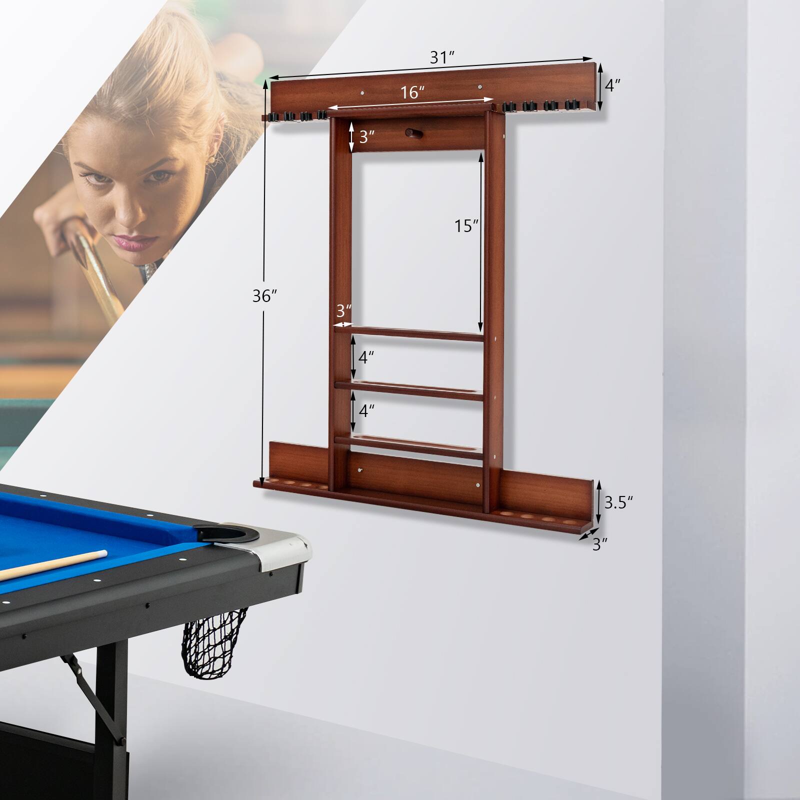 - A:Answer The product dimensions of the cue rack are 31 inches long, 3 inches wide, and 36 inches high.