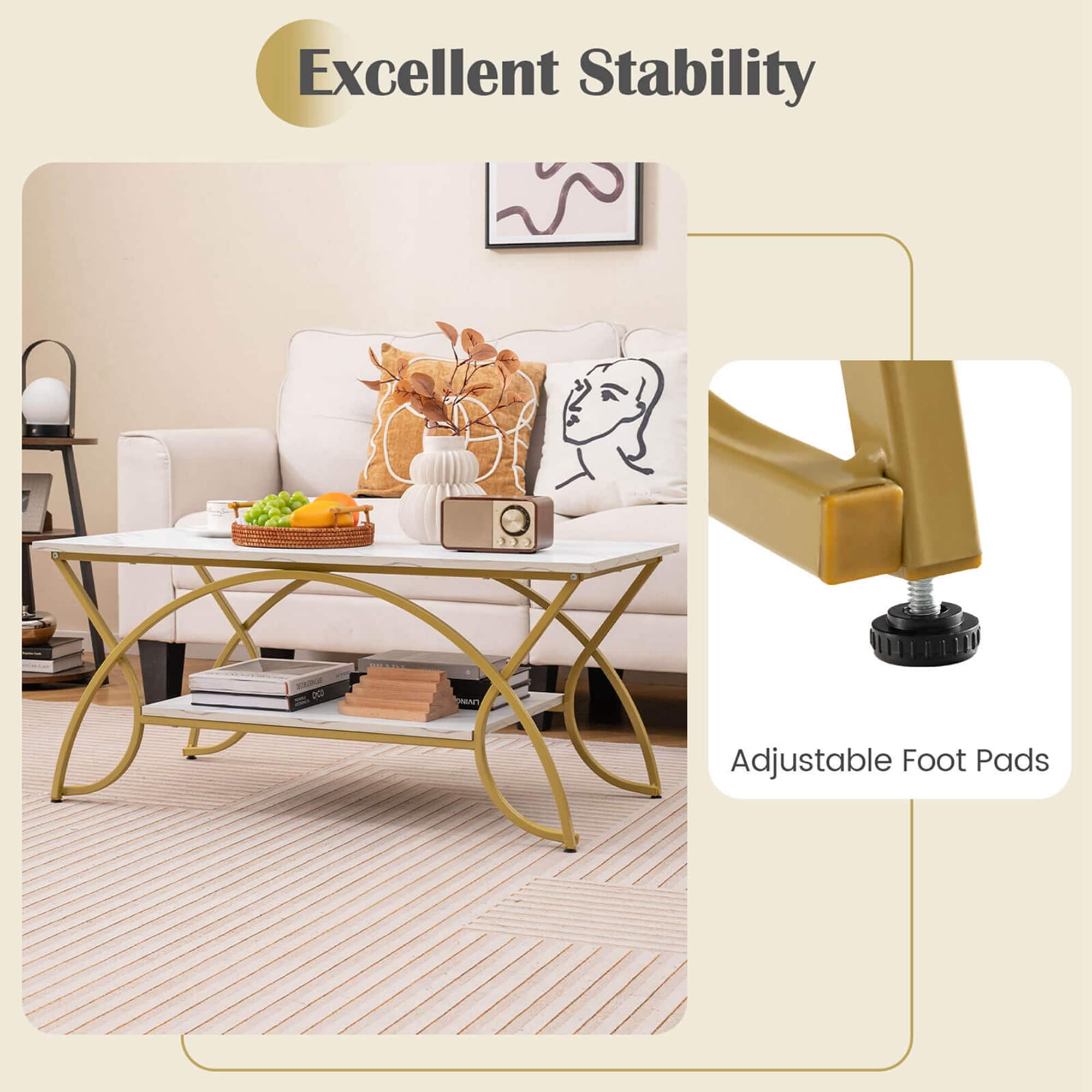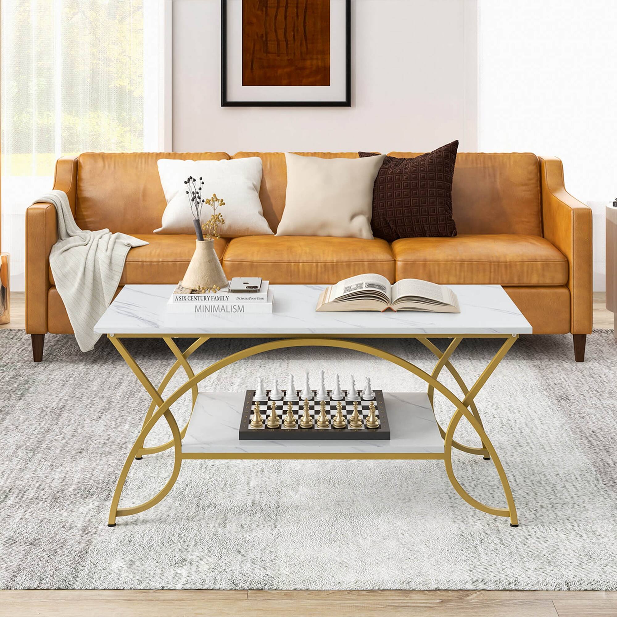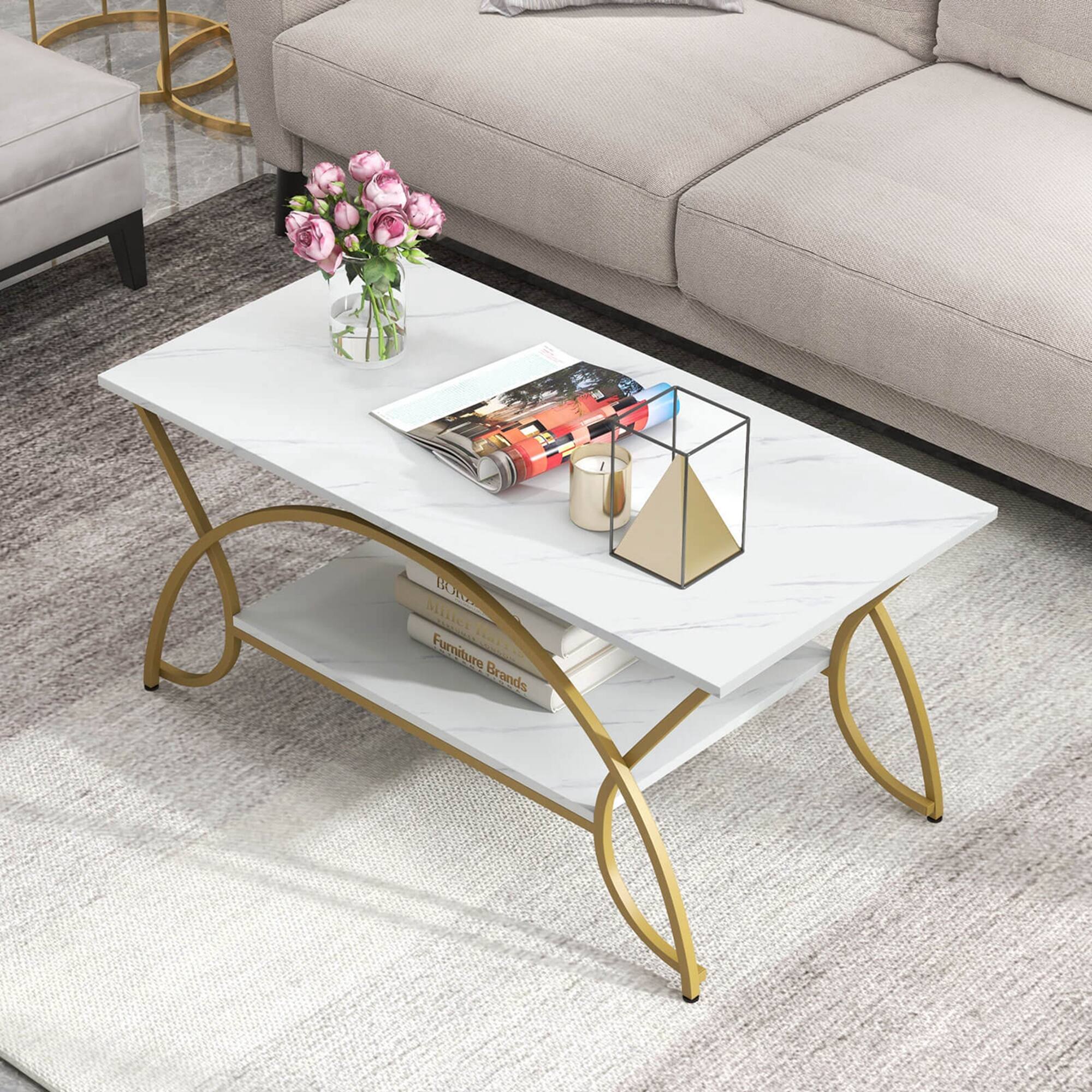 - A:Answer The coffee table features a white faux marble tabletop and sleek gold metal legs.