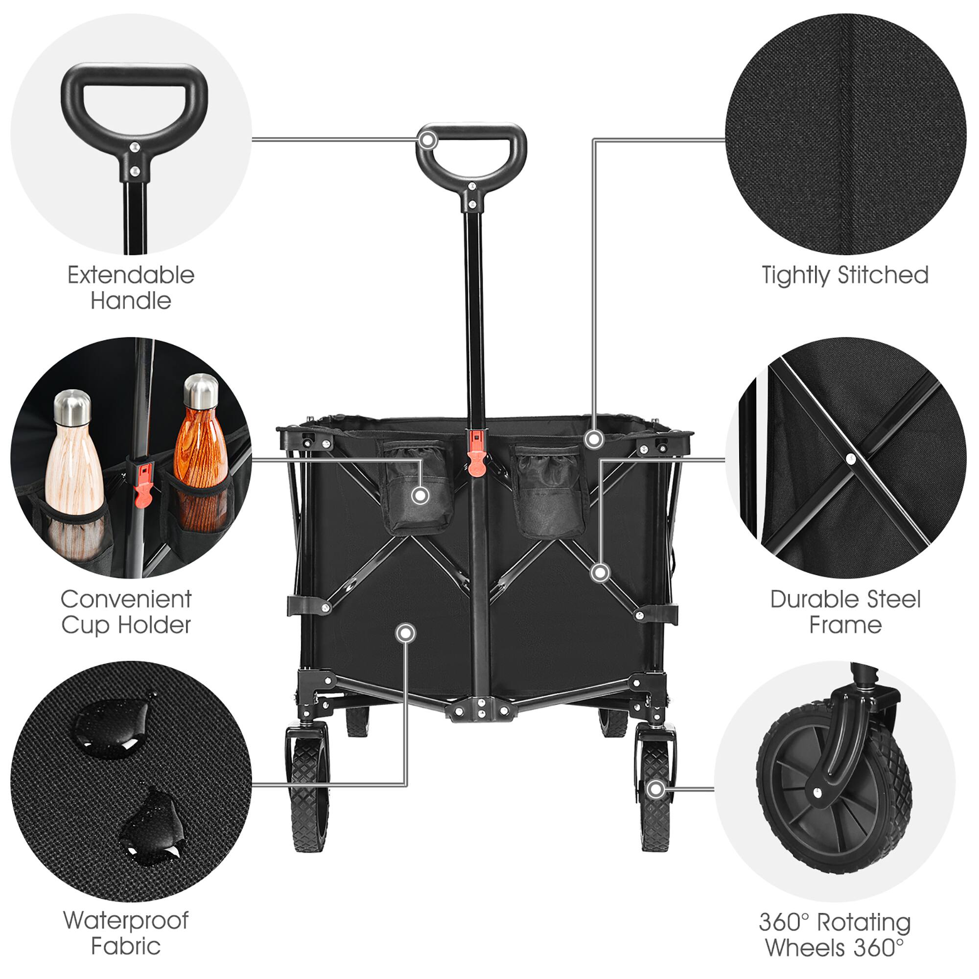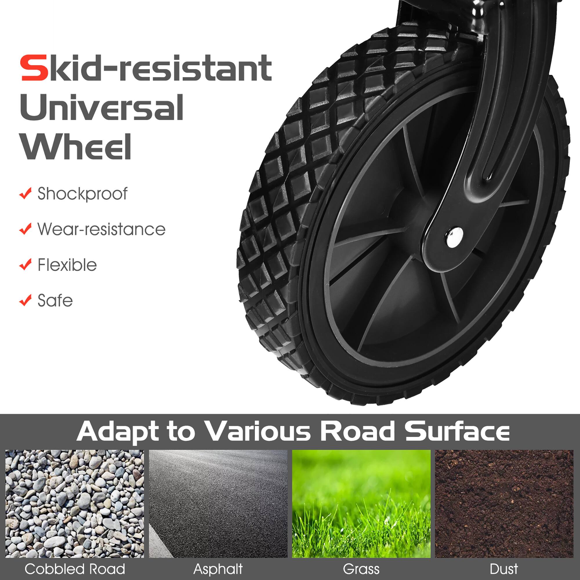 - A:Answer The wagon has sturdy and flexible swivel wheels that run smoothly on rough roads. This makes it a versatile option for various terrains.
