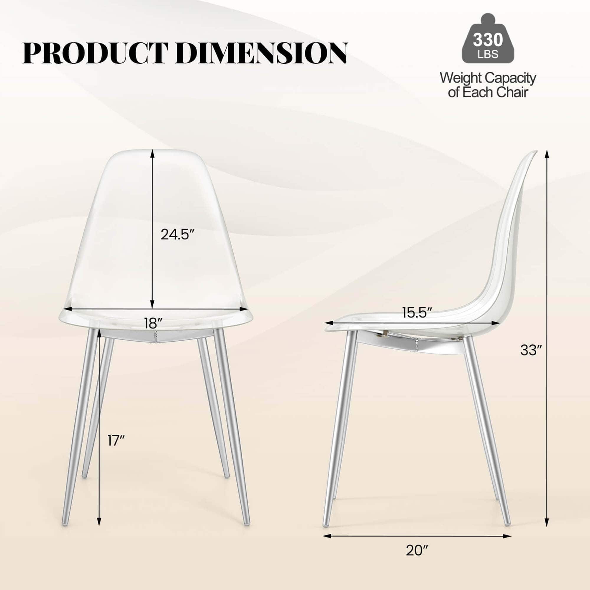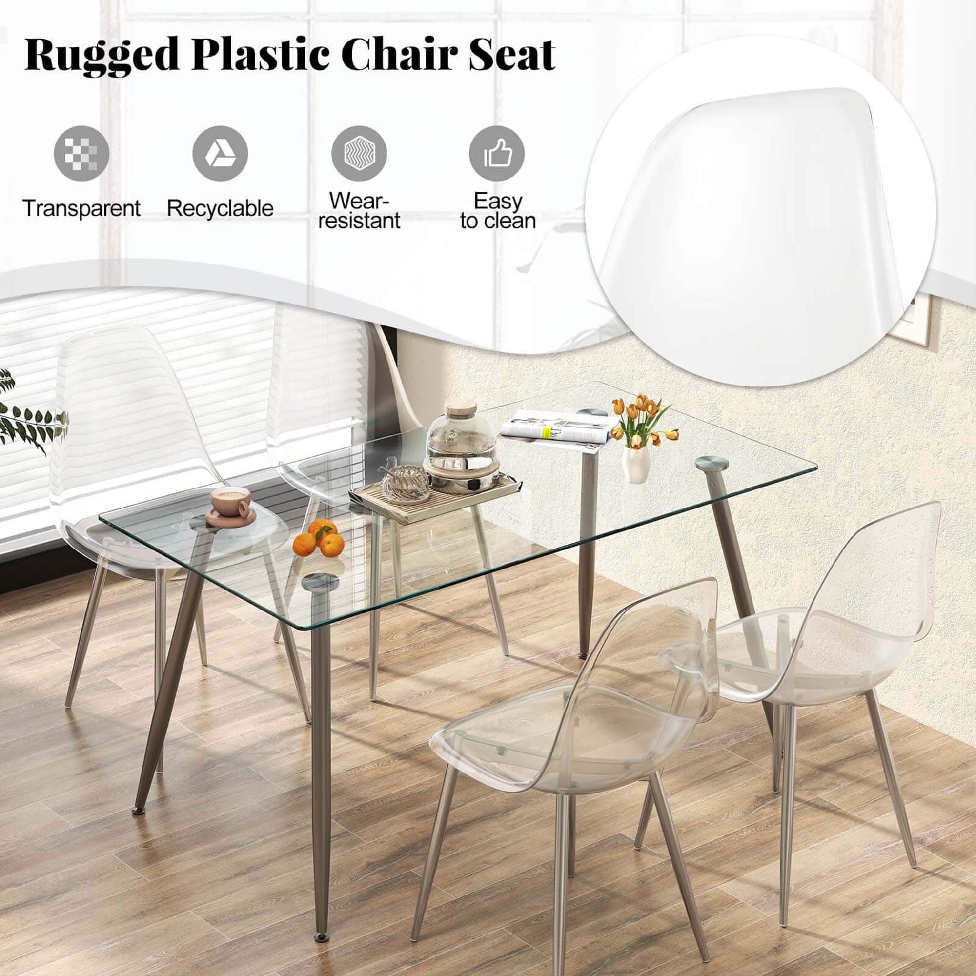 - A:Answer These chairs have a modern minimalist style with a transparent seat and silver metal legs.