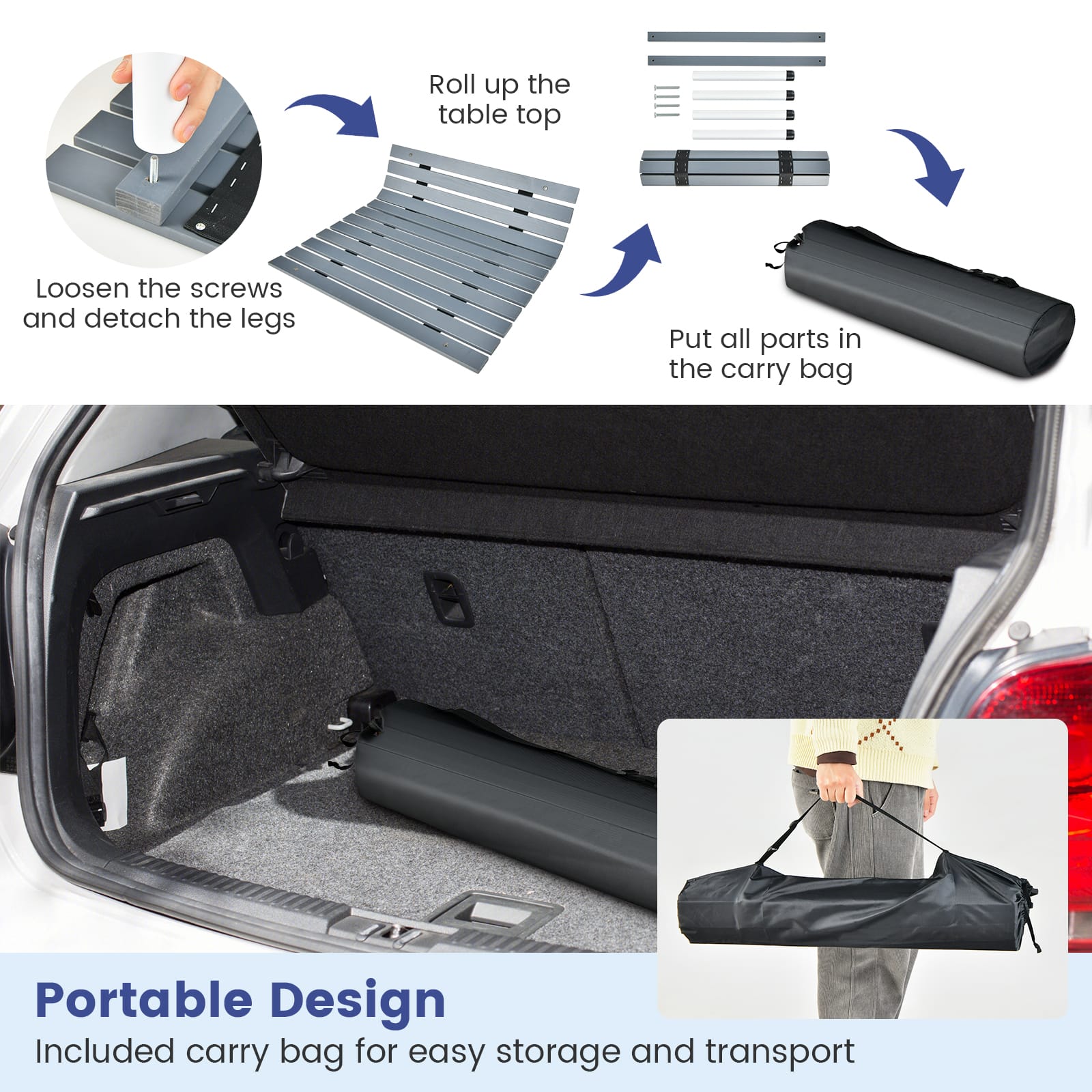 - A:Answer The table's legs and crossbars detach, and the tabletop rolls up for simple folding and storage in the included carry bag.