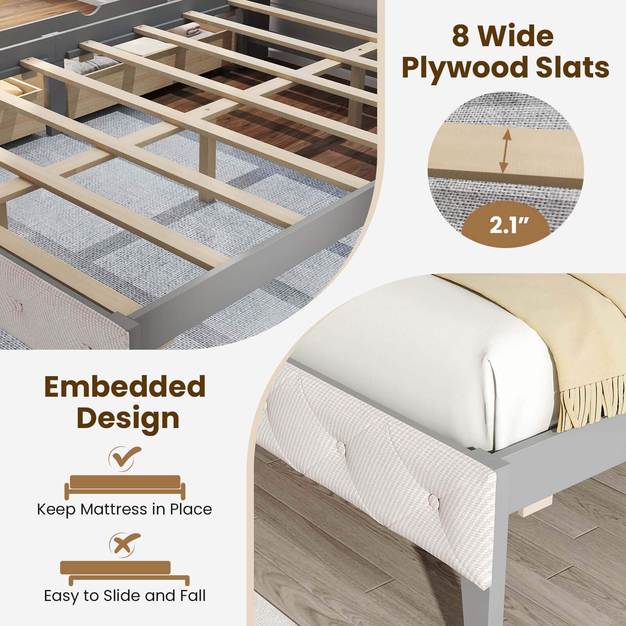 - A:Answer The mattress is held in place by 8 wide slats and the bed's embedded design.