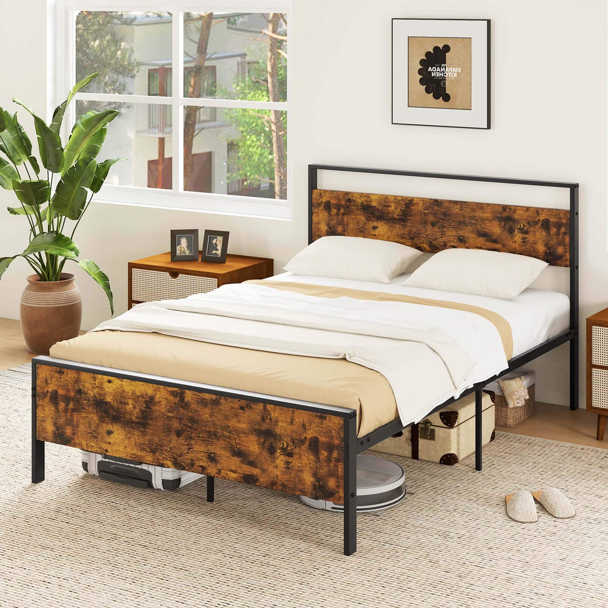 - A:Answer The bed frame is constructed with a combination of metal and rustic wood.