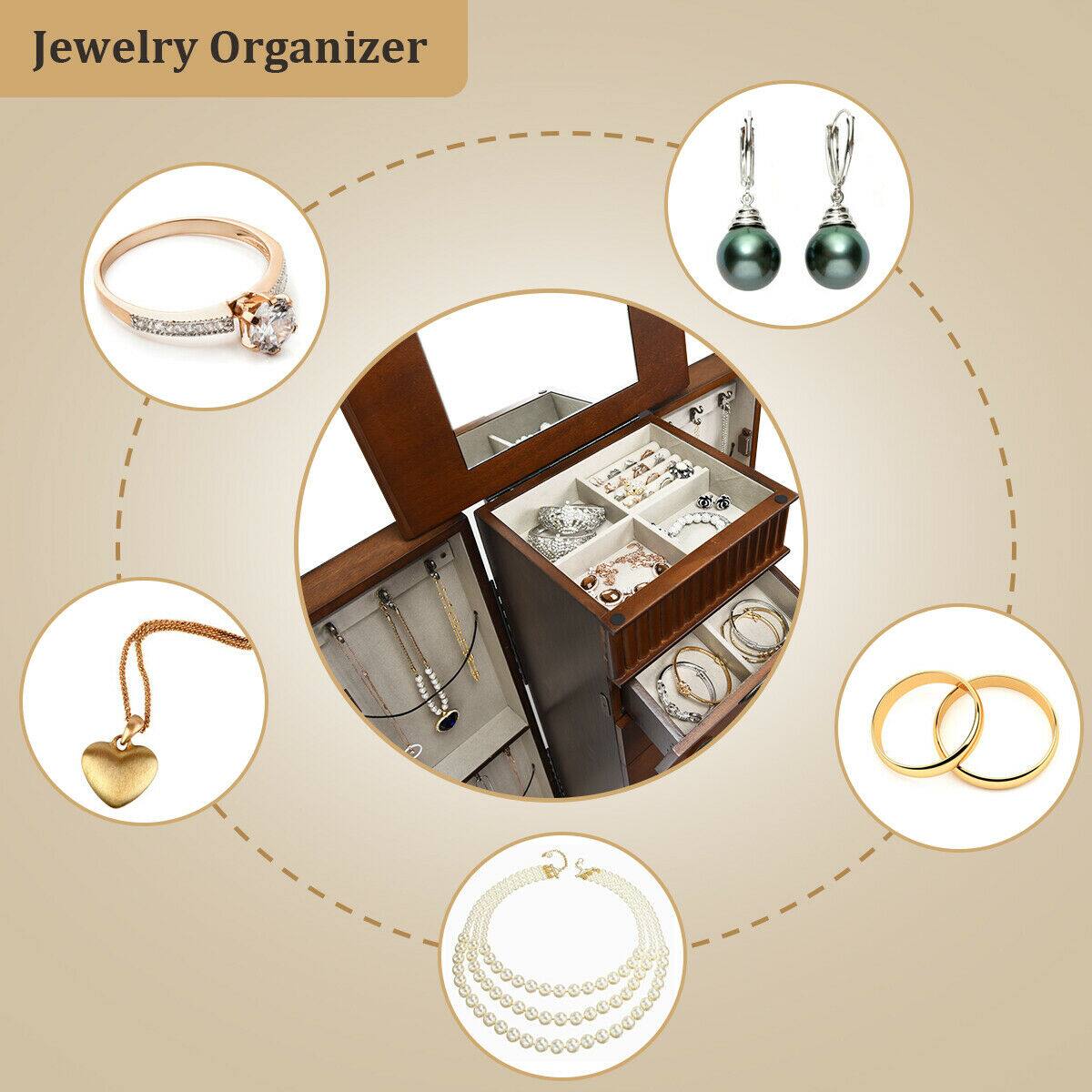 - A:Answer This jewelry cabinet features a super-high stand design to prevent your jewelry from becoming damp.