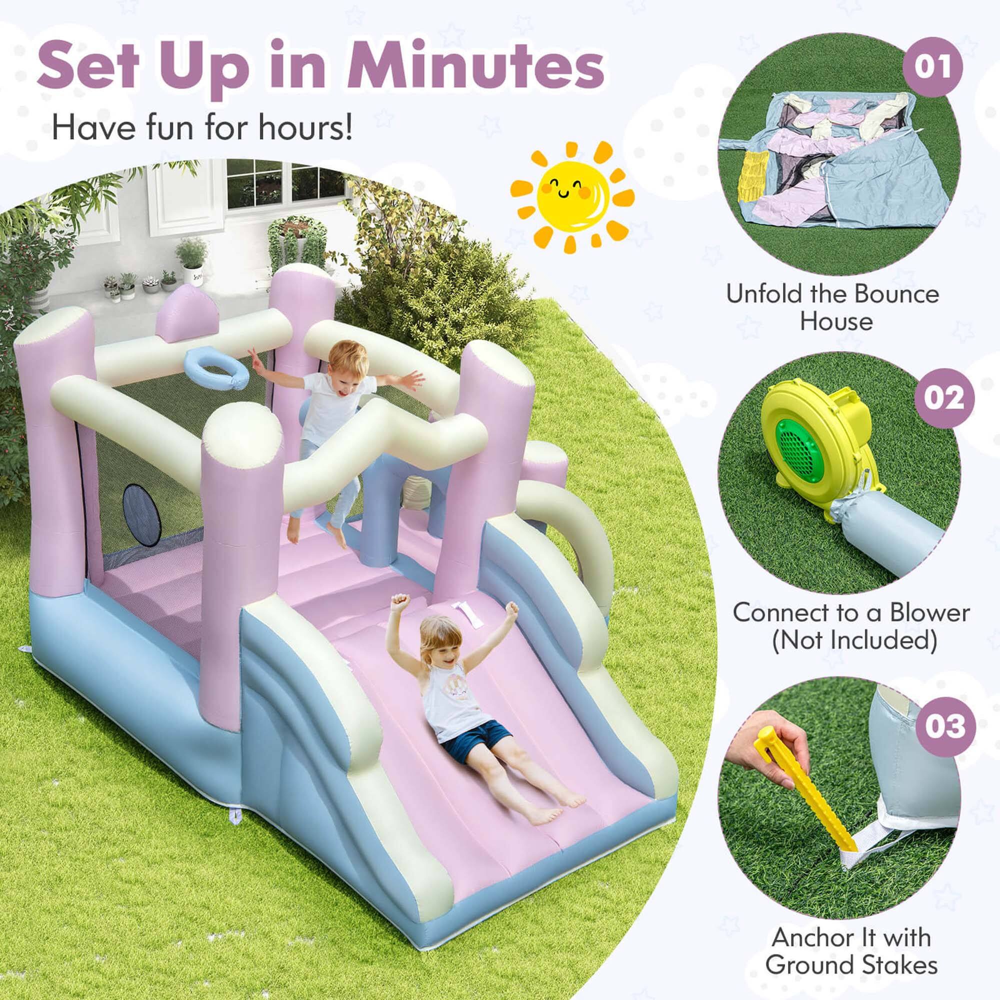 - A:Answer The bounce house inflates quickly in minutes with a 480W blower (not included). Remember to keep the blower running during use.