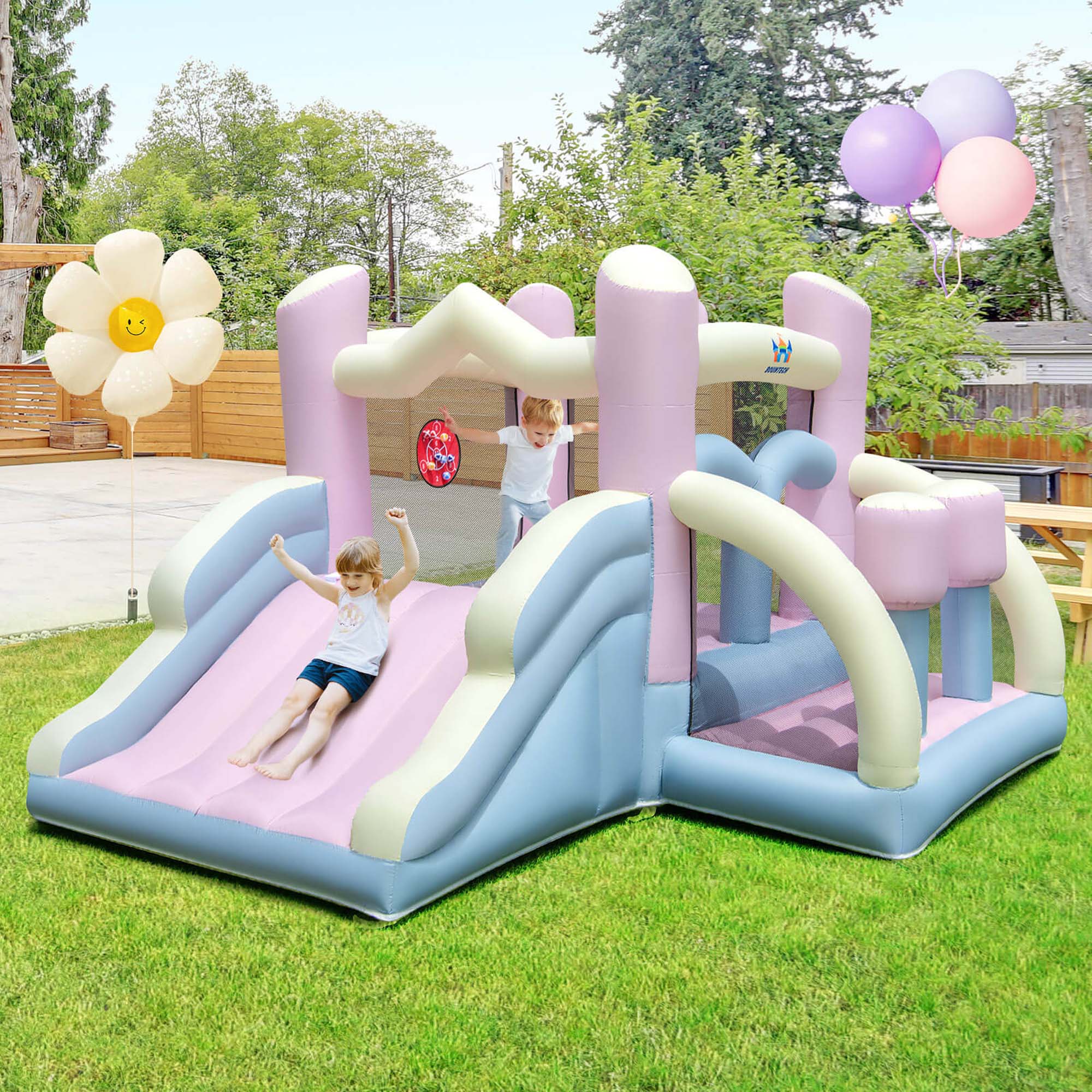 - A:Answer The bounce house comes with a carry bag, a repair kit, 8 target balls, an inflatable basketball, and a hand pump.