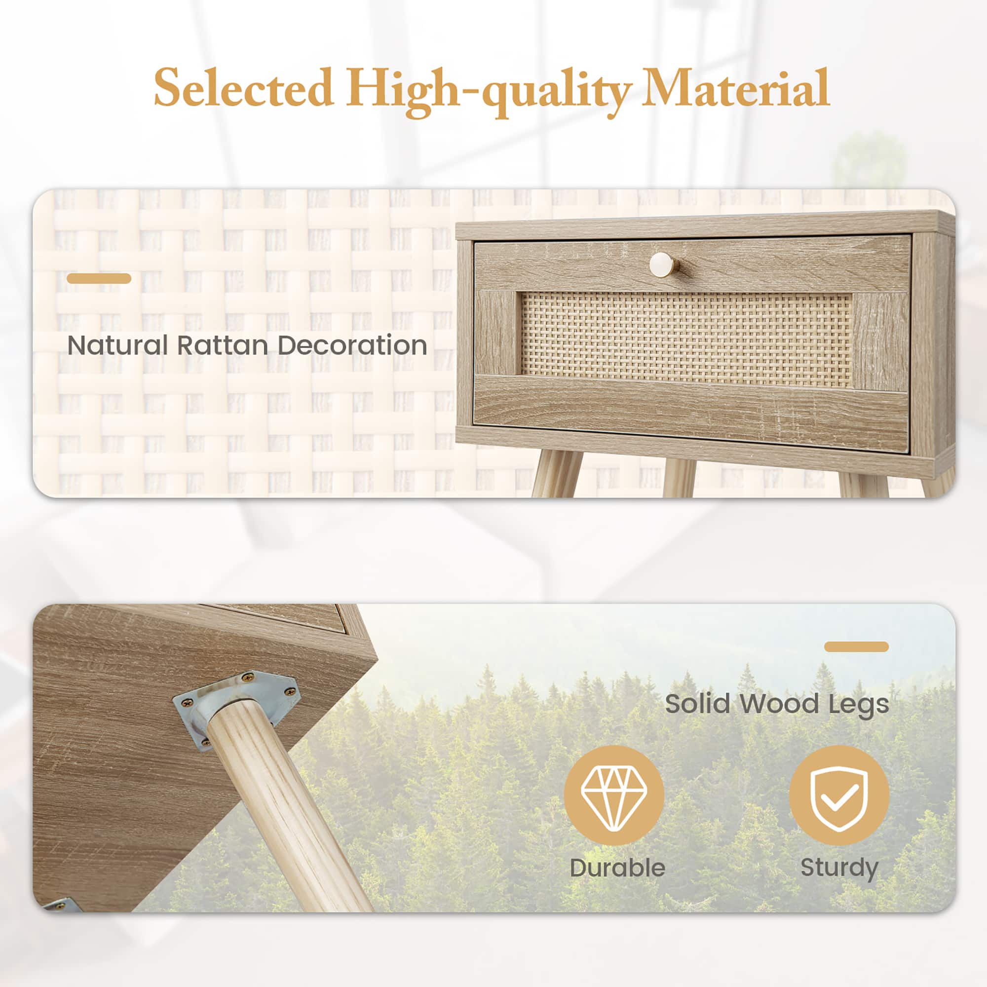 - A:Answer The drawer has a rattan look which complements the oak finish of the nightstand.