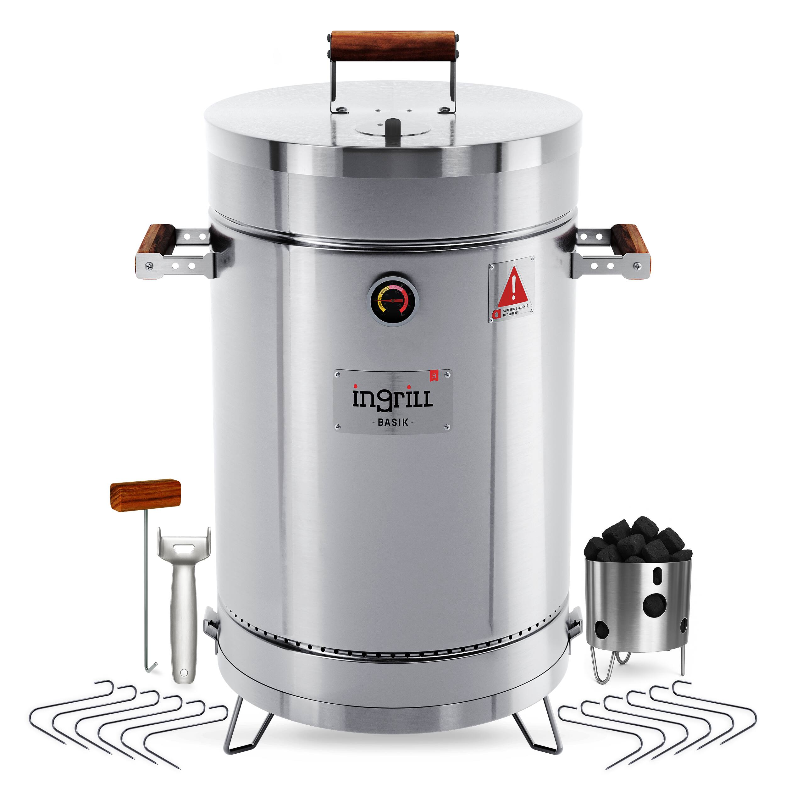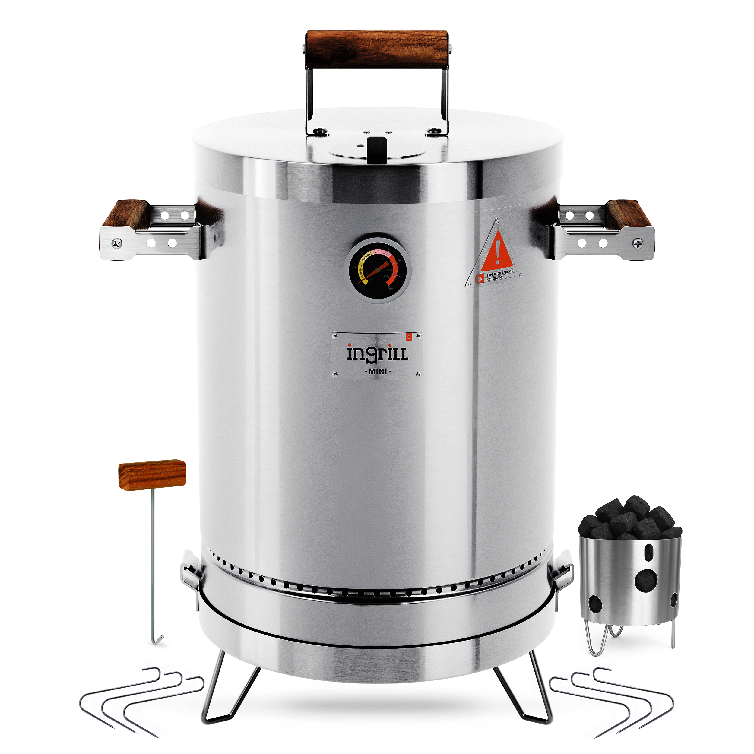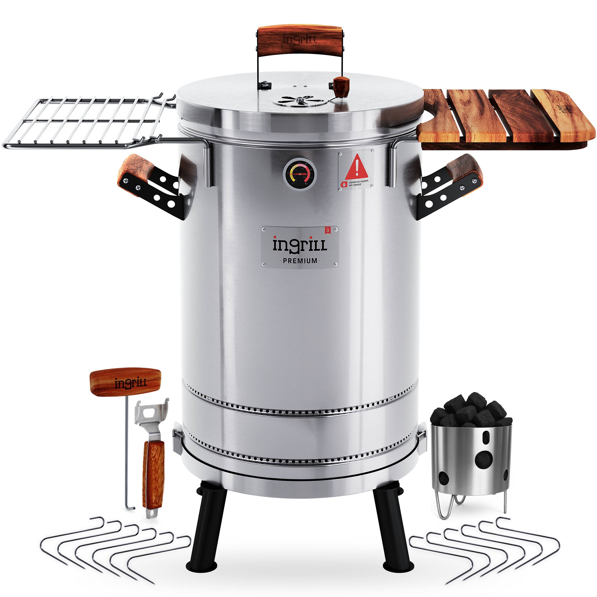 - A:Answer The grill is designed with wooden handles to prevent burns and a front wood shelf for convenient access to grilling tools and spices.