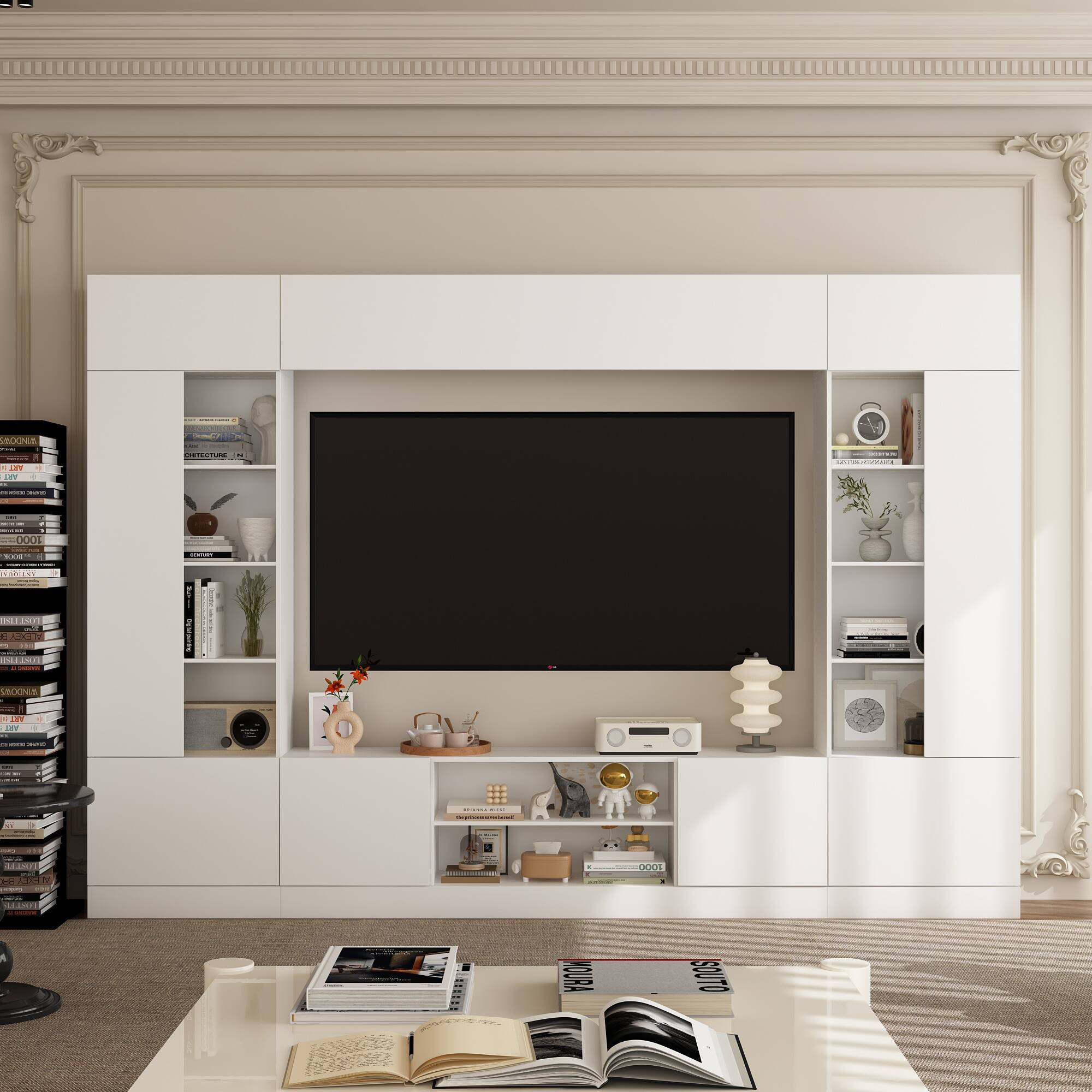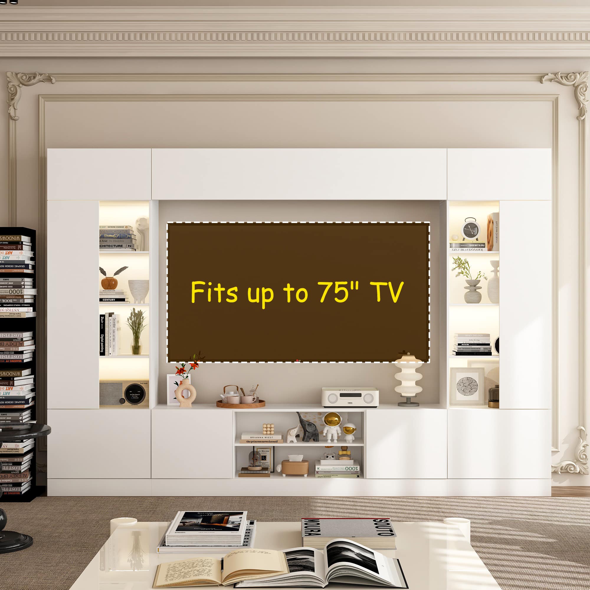 FUFU & GAGA - Entertainment Center with Surround Design for 75 Inch TVs, Media Console with Adjustable Lighting Cable Management - White