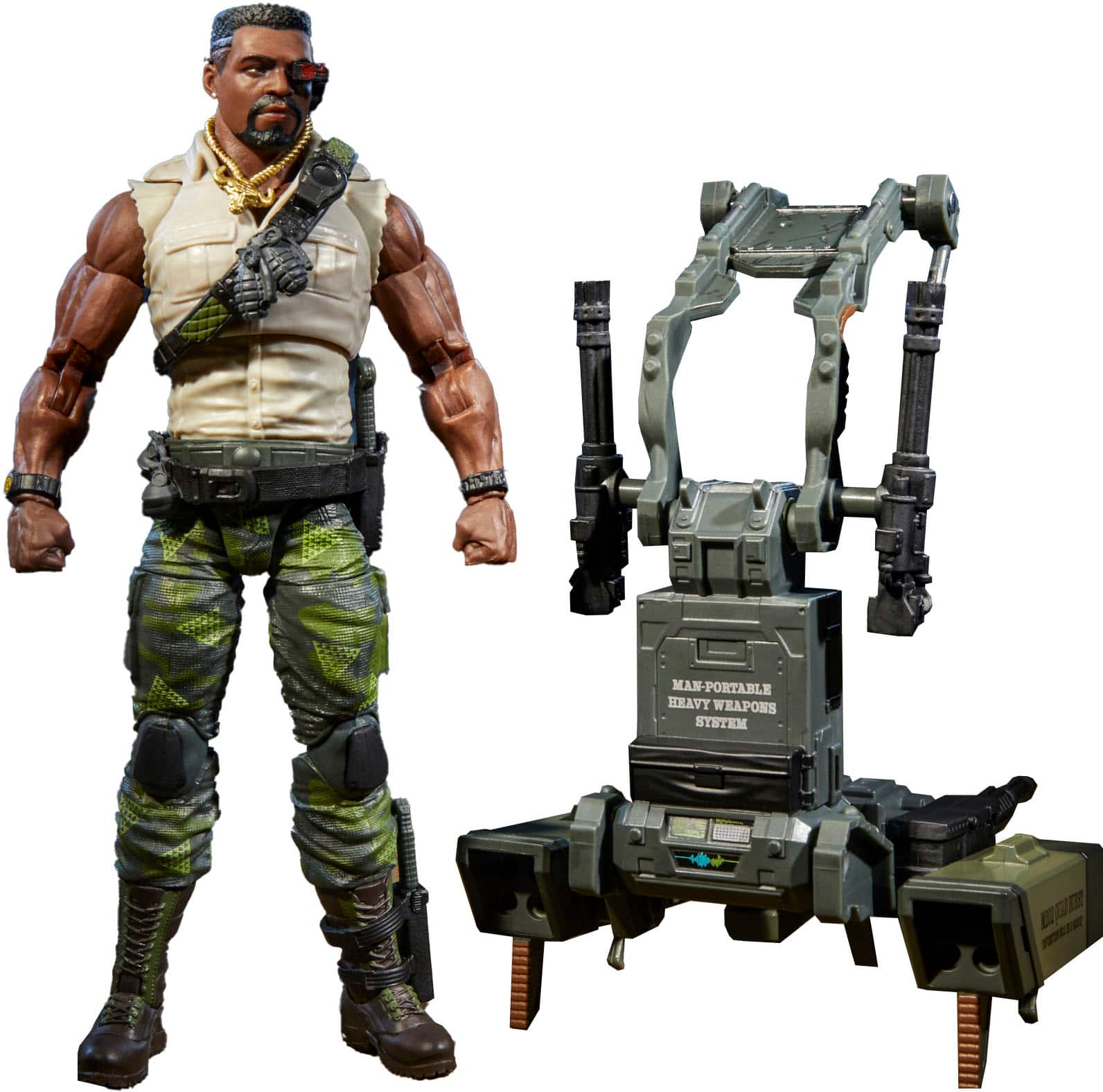 - A:Answer This Heavy Duty Deluxe figure set includes 30 character-inspired accessory pieces that attach to him and his Man-Portable Heavy Weapons System. Some of the accessories included are two detachable M202 Quad Burst missile launchers, eight missiles, eight blast effects, two laser cannons, an ammo belt, two rotary cannons, two knives, an alternate head, two alternate hands, headphones, and a range finder.