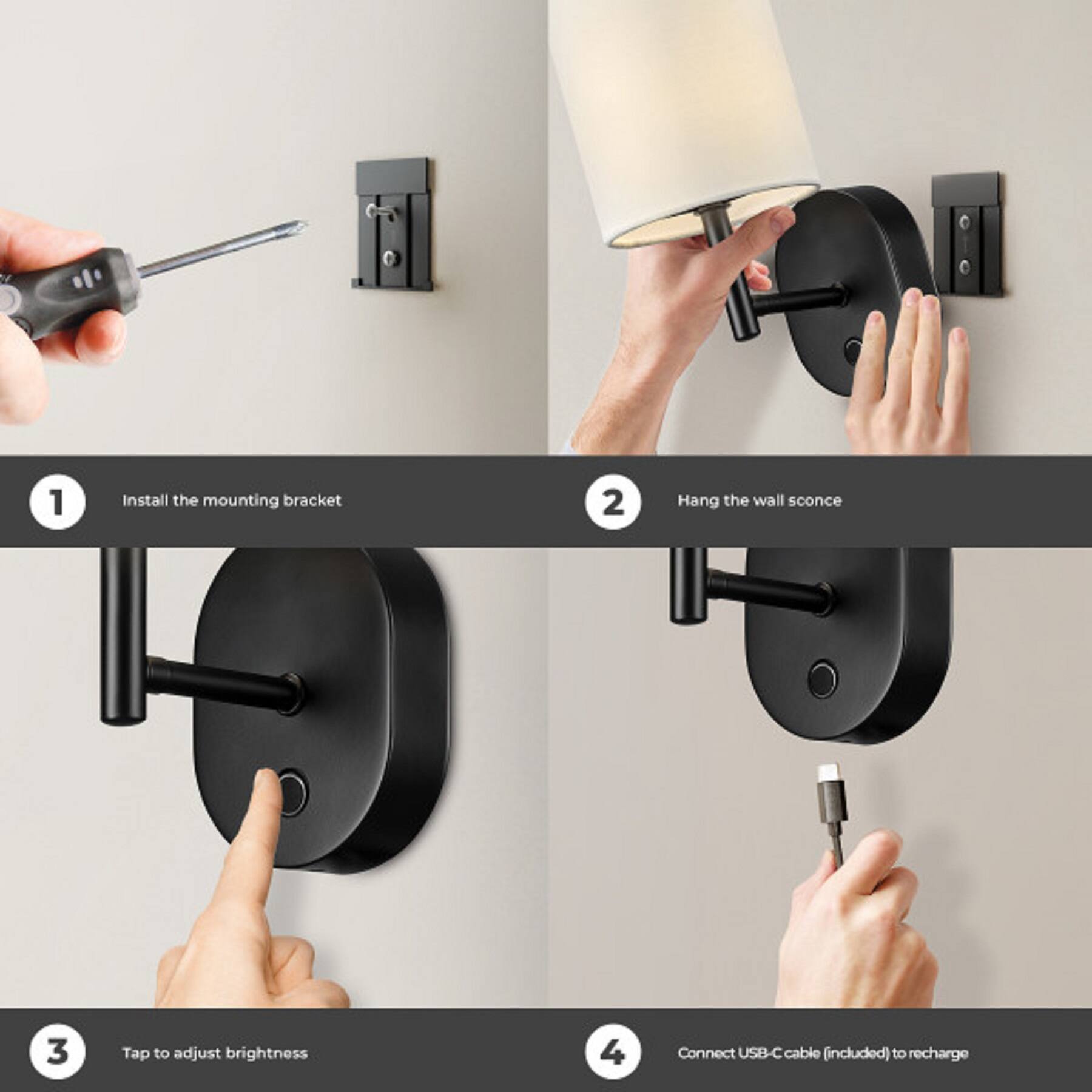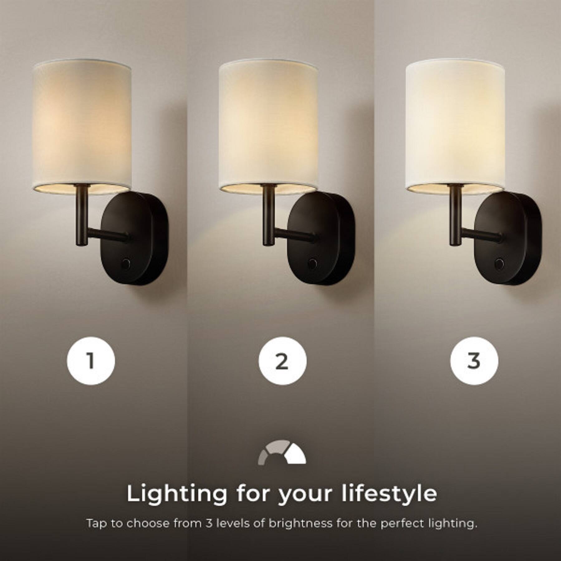 - A:Answer The sconce has an on/off 3-step dimmer touch switch, offering three brightness levels (10%, 50%, and 100%).