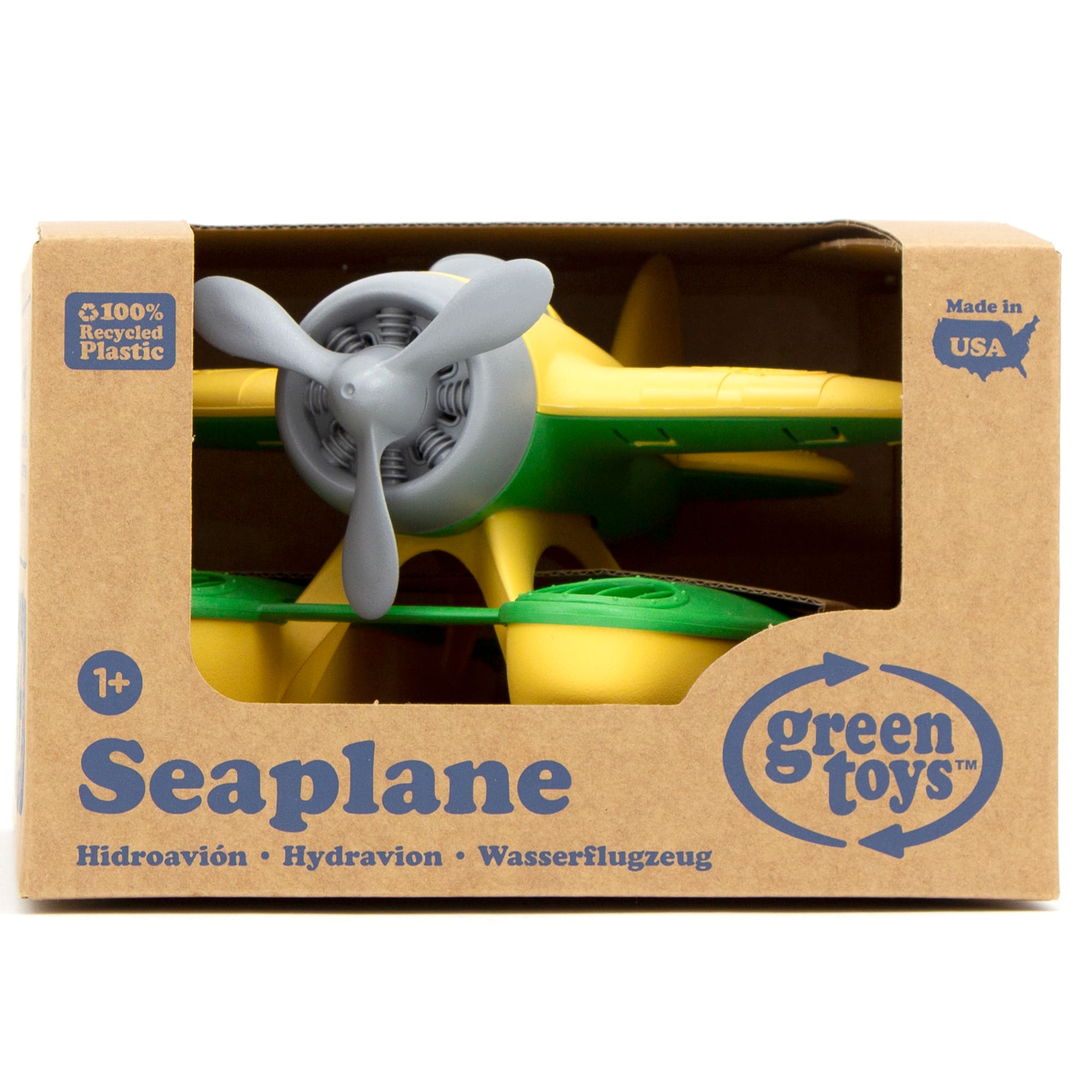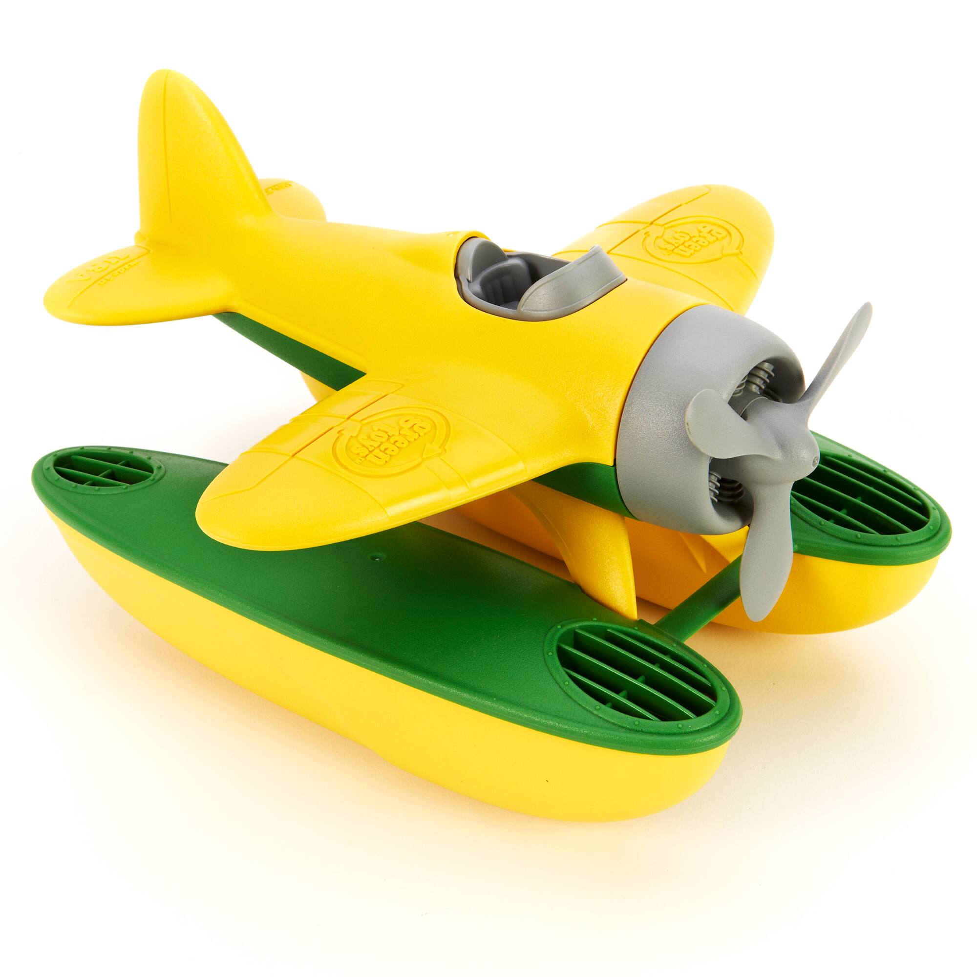 - A:Answer This buoyant yellow and green floatplane features a spinning propeller.