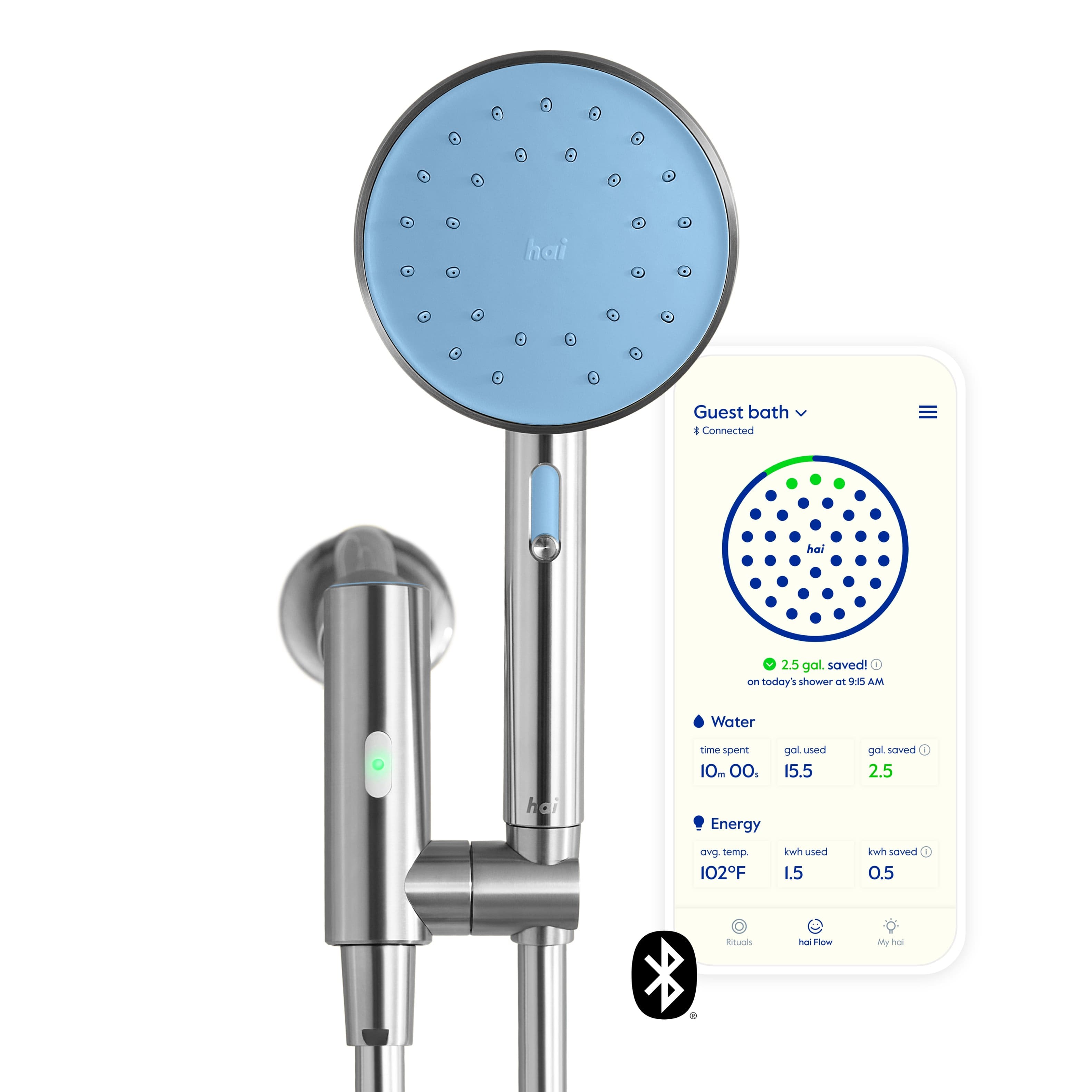 This question and answer was generated by AI based on customer and product data.QuestionHow does the water-powered Bluetooth technology in the showerhead connect to the hai app, and what data does it track?