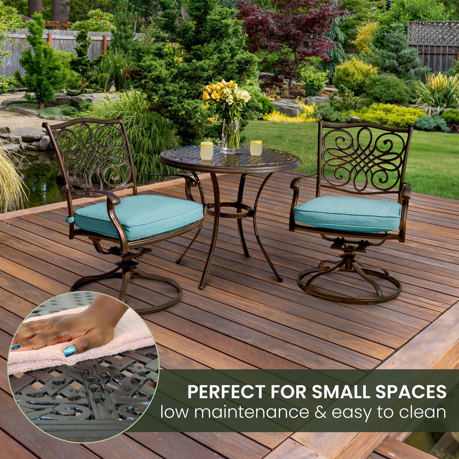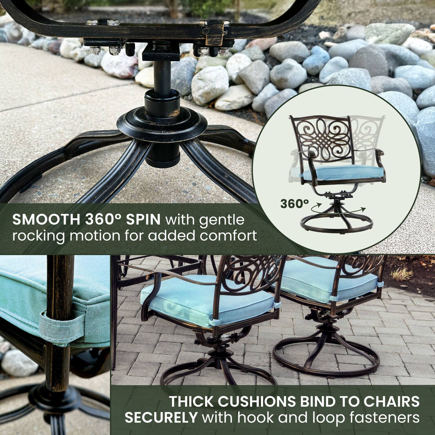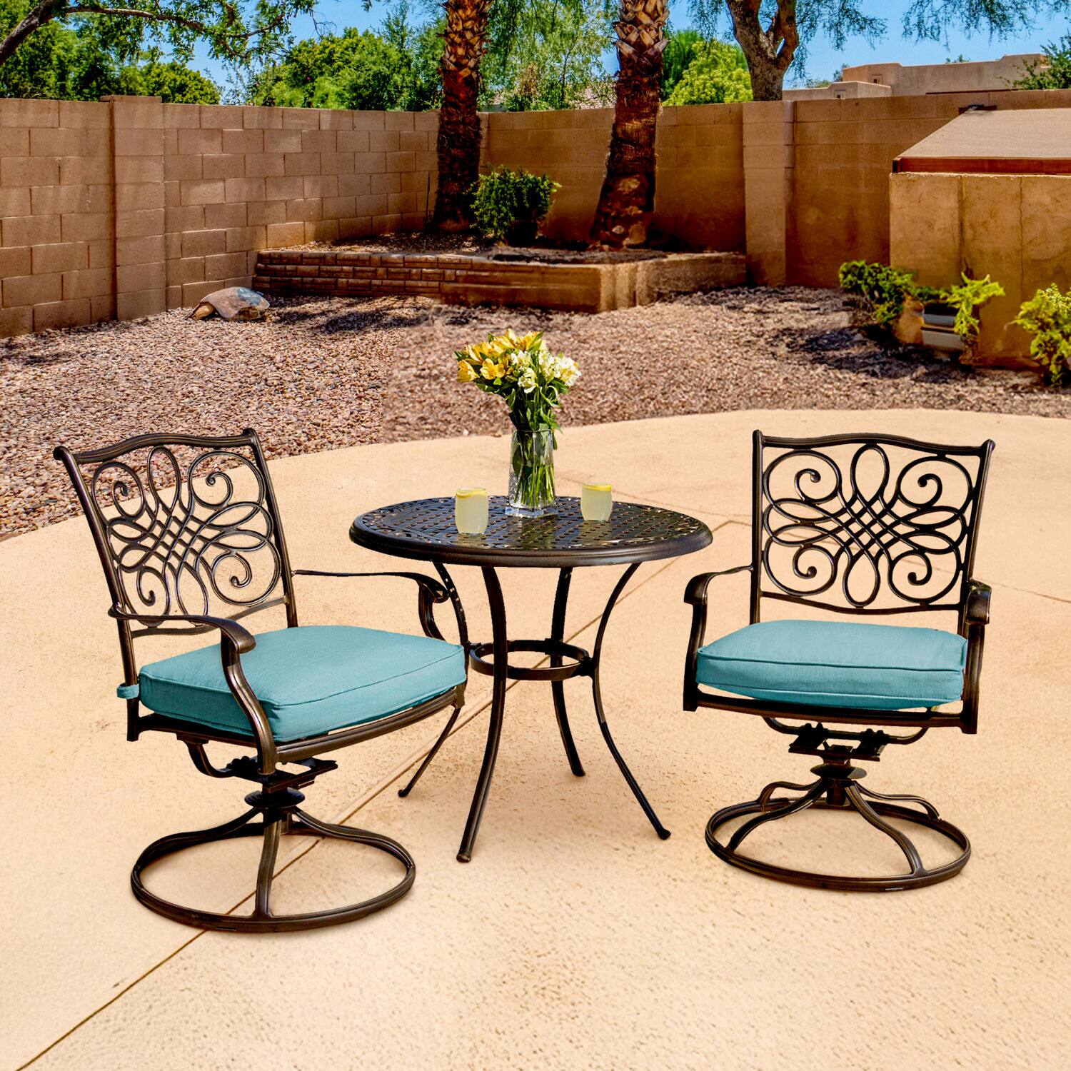 - A:Answer This bistro set includes two cushioned swivel rockers and a table.