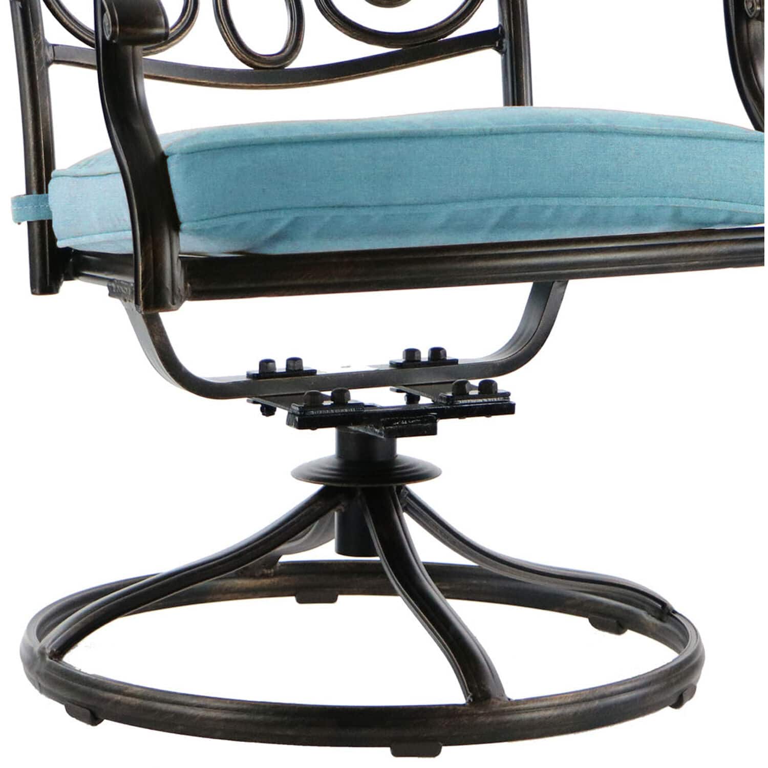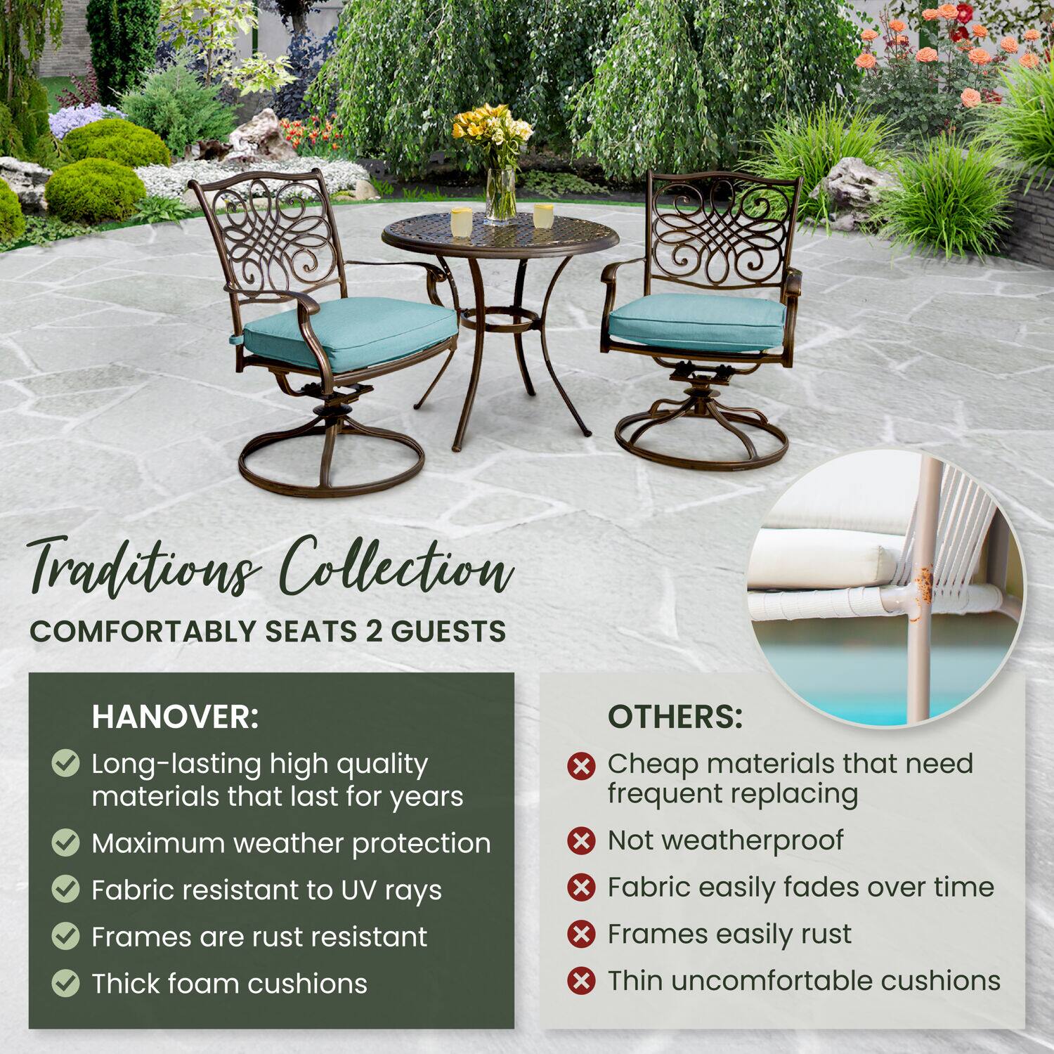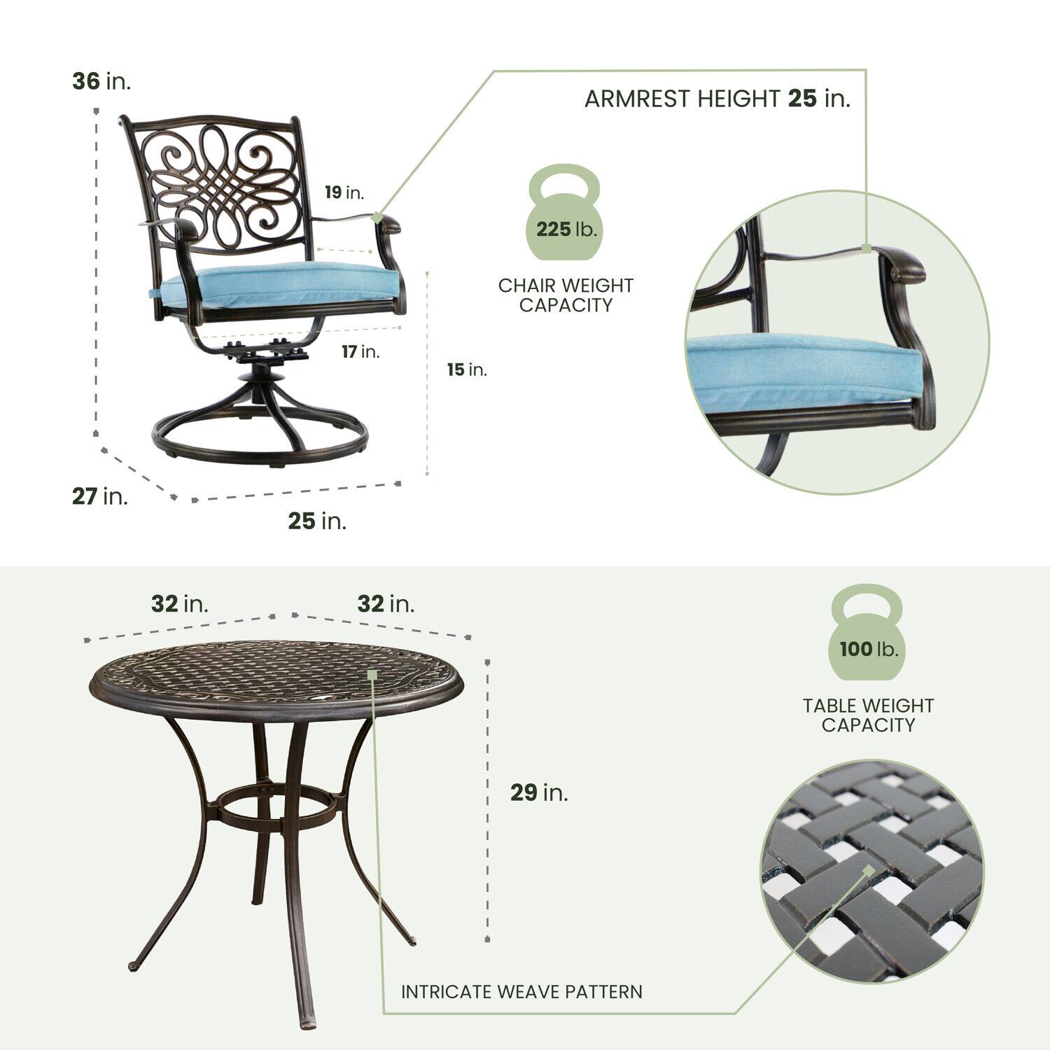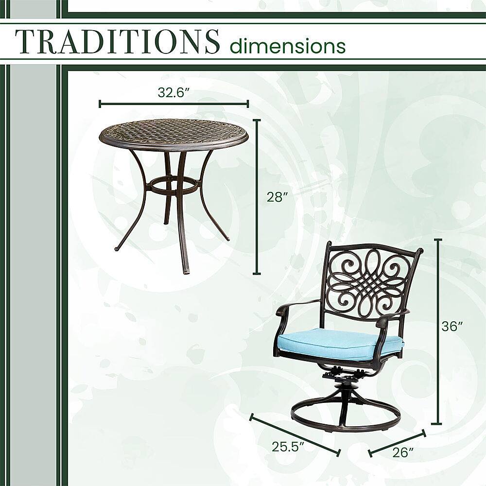 - A:Answer This bistro set includes two cushioned swivel rockers and a table.