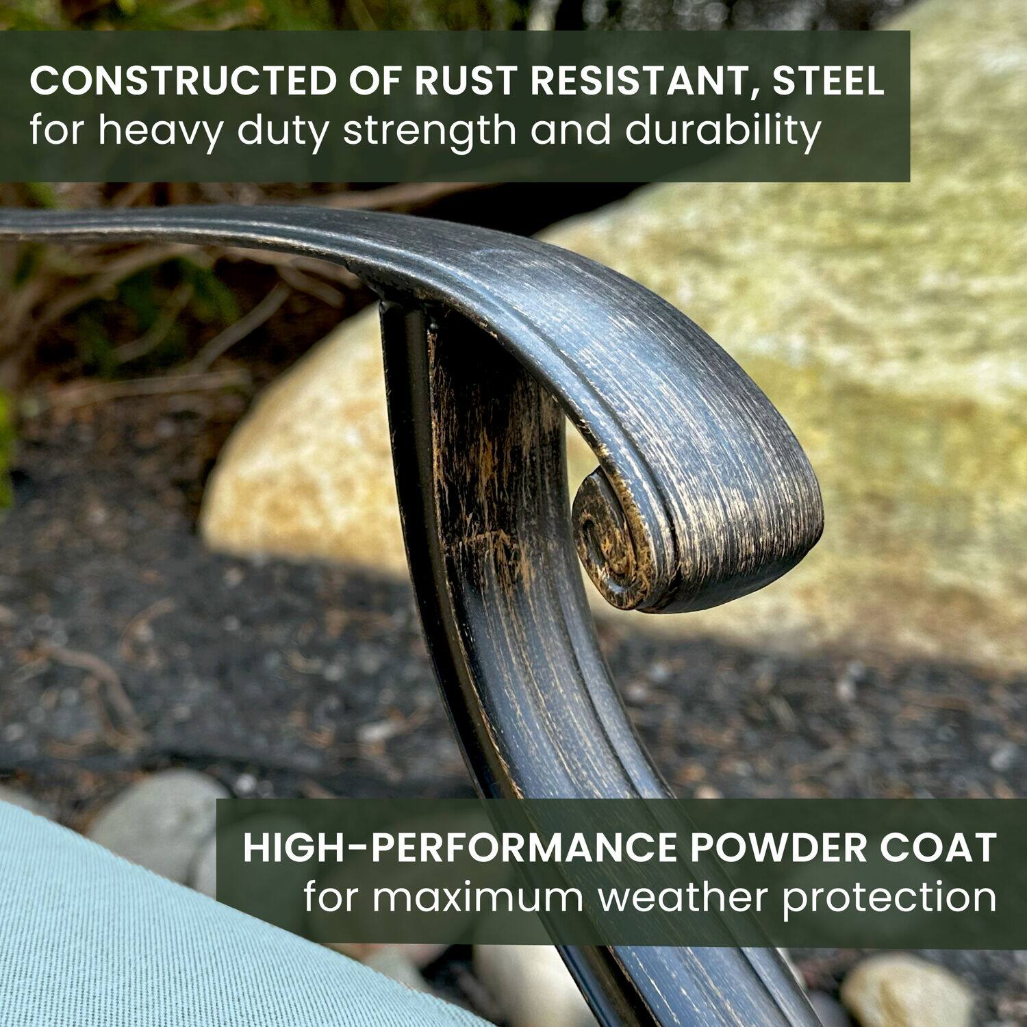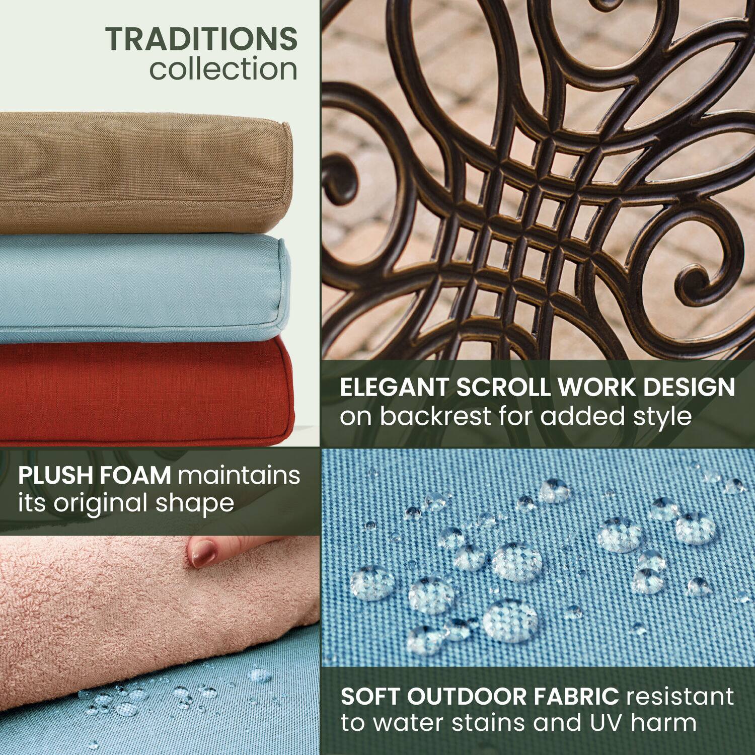 - A:Answer The premium outdoor fabric used for the seat cushions is quick to dry and resists accidental stains and UV damage.
