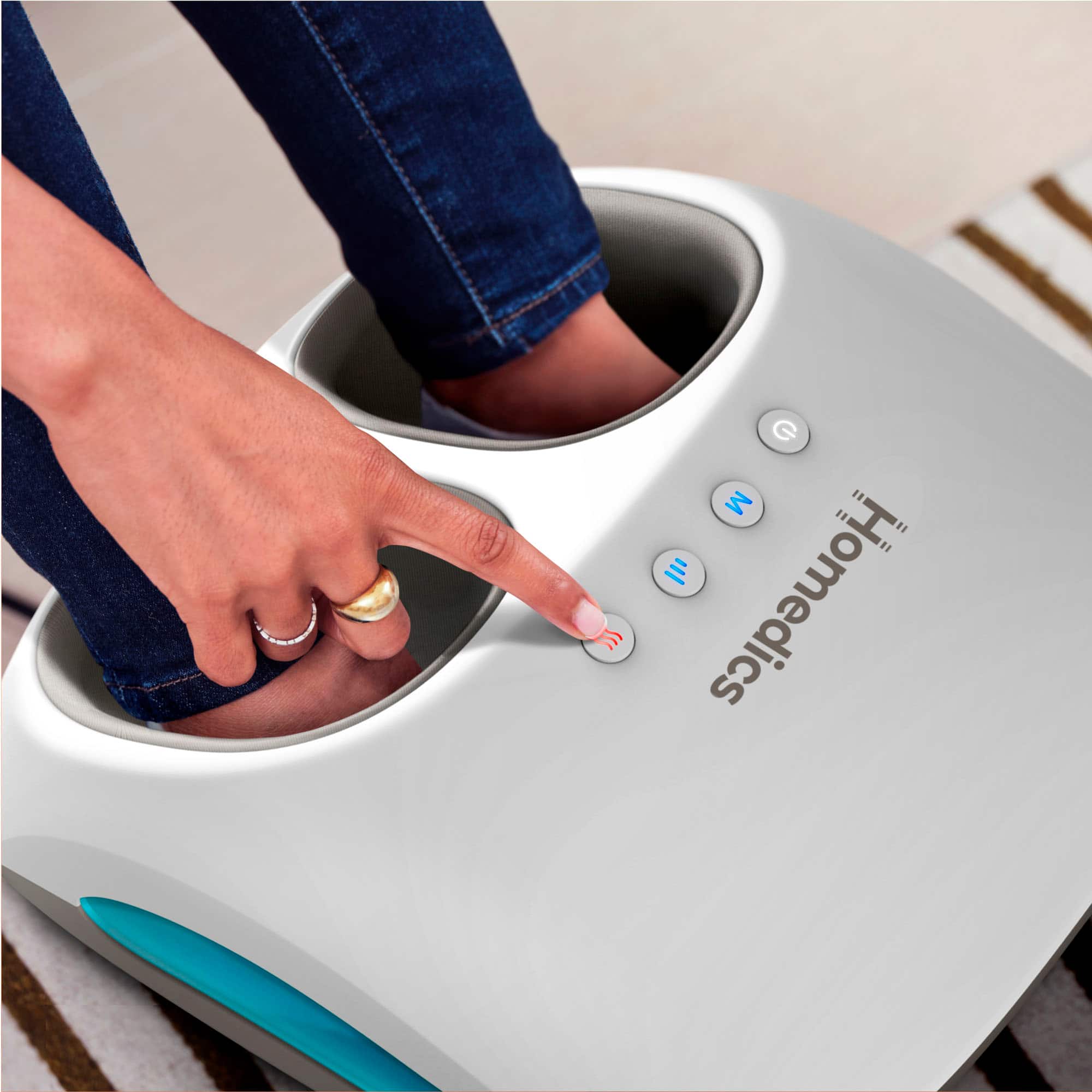 - A:Answer The Homedics Shiatsu + Air 3.0 Foot Massager with Heat offers an optional heat function that you can control according to your preference. The heat feature does not activate automatically; instead, you can turn it on or off using the designated heat button. When you press the heat button, the indicator light will illuminate red, signaling that the heat function is active. Pressing the button again will turn off the heat. For safety reasons, the heat function can only be used when the massage function is active.