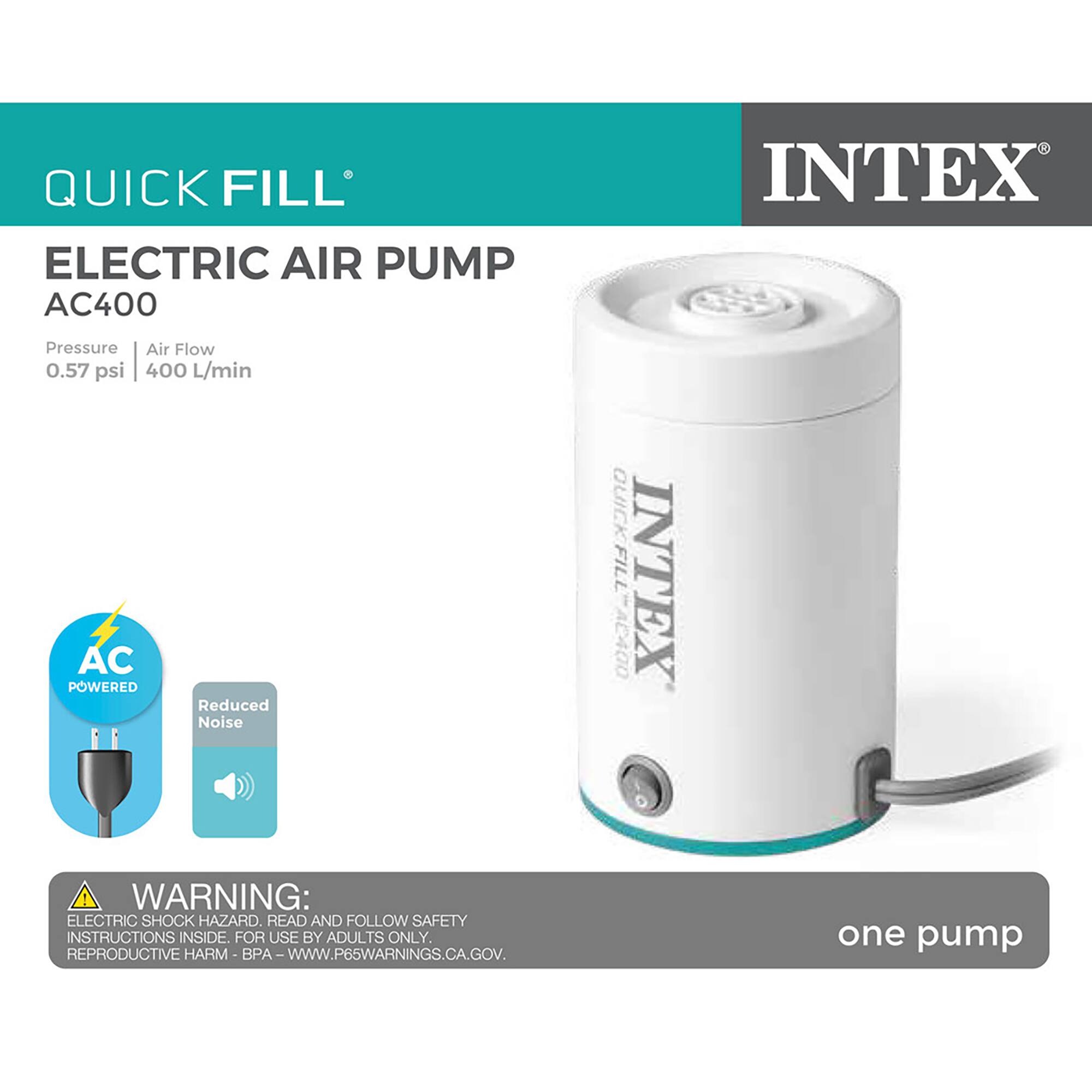 - A:Answer The Intex QuickFill AC400 Electric Air Pump has a maximum airflow of 400 L/minute.