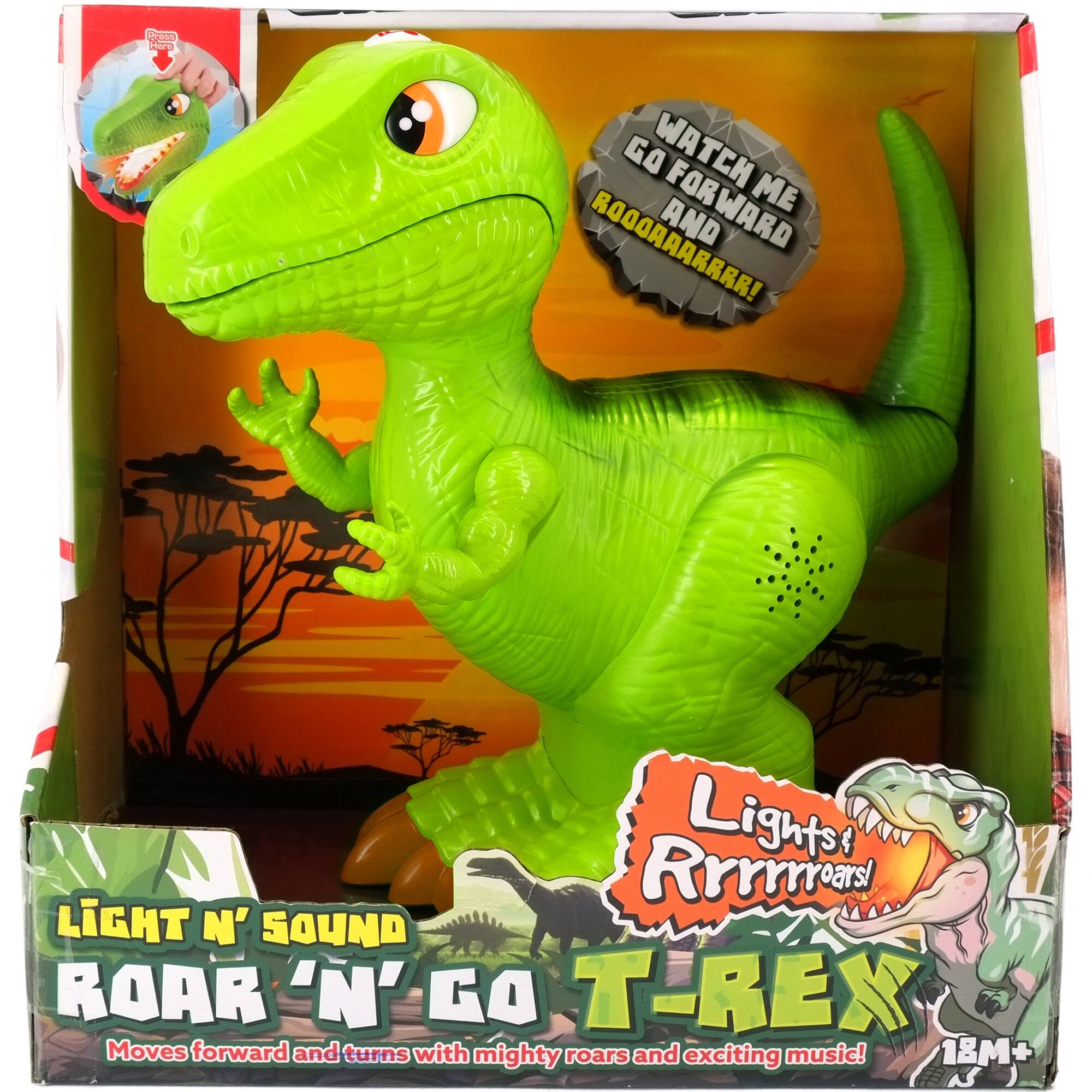 - A:Answer This T-Rex toy roars when it moves. You can press a button to make it open its mouth and roar, creating a fun and interactive play experience.
