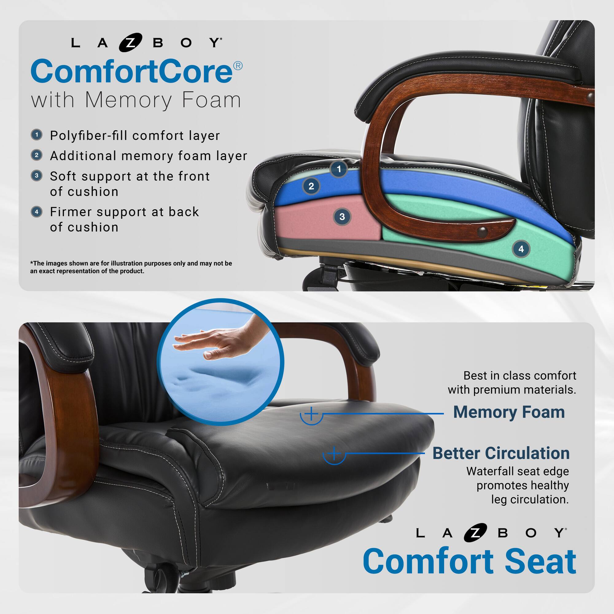 - A:Answer The La-Z-Boy Edmonton Executive Office Chair uses Comfort Core Plus memory foam cushions.