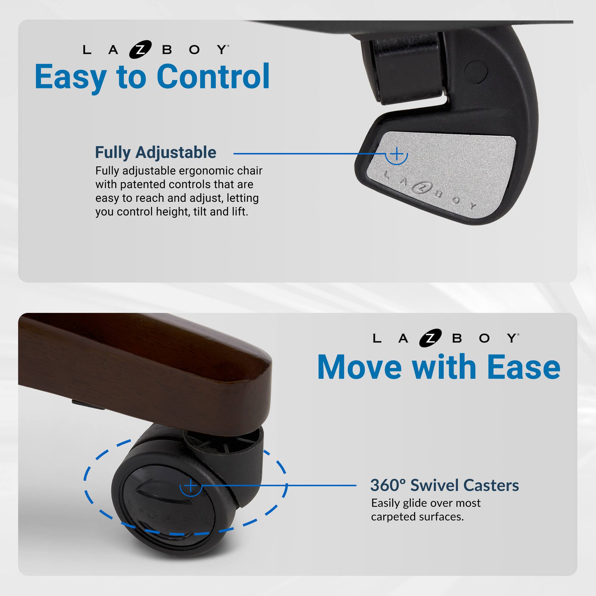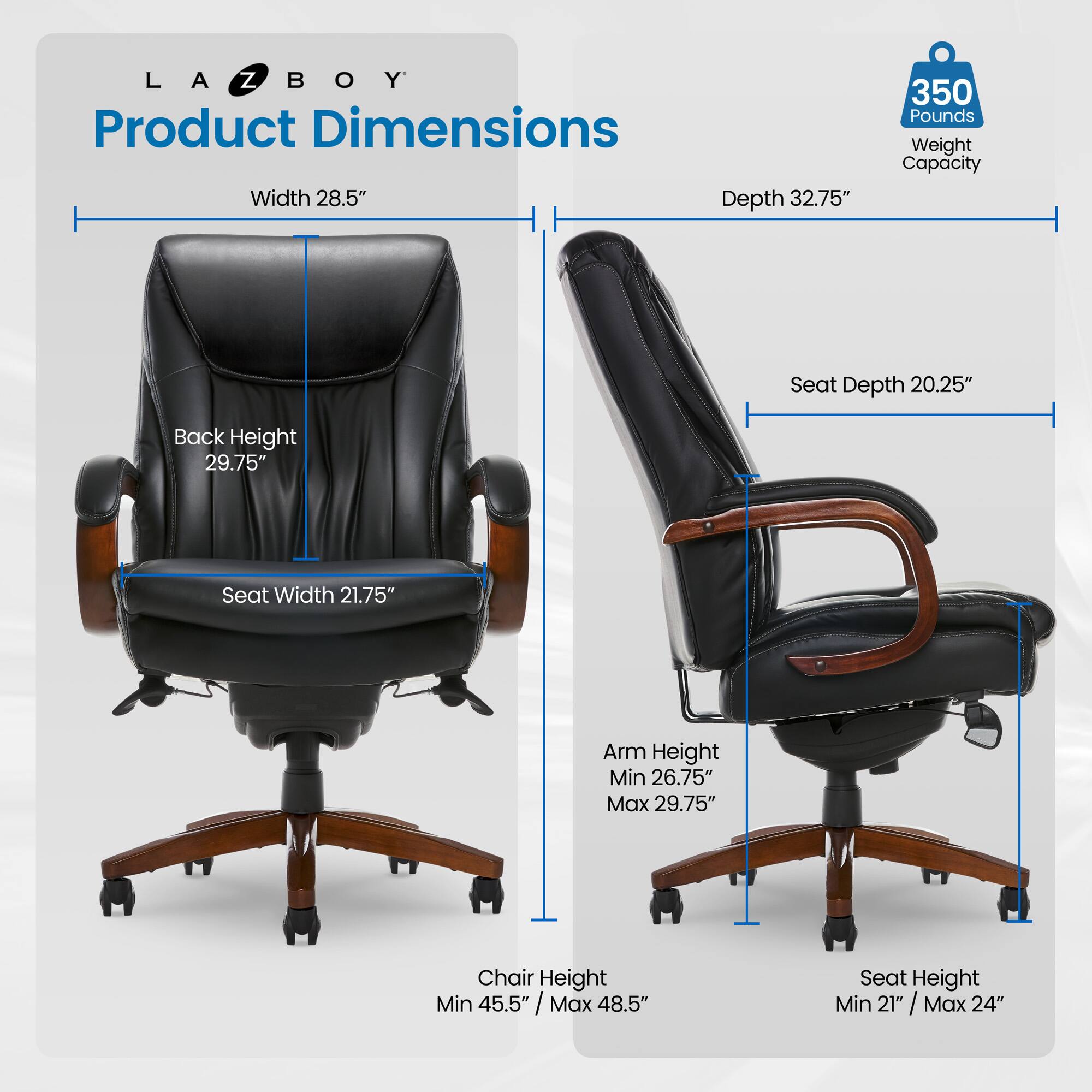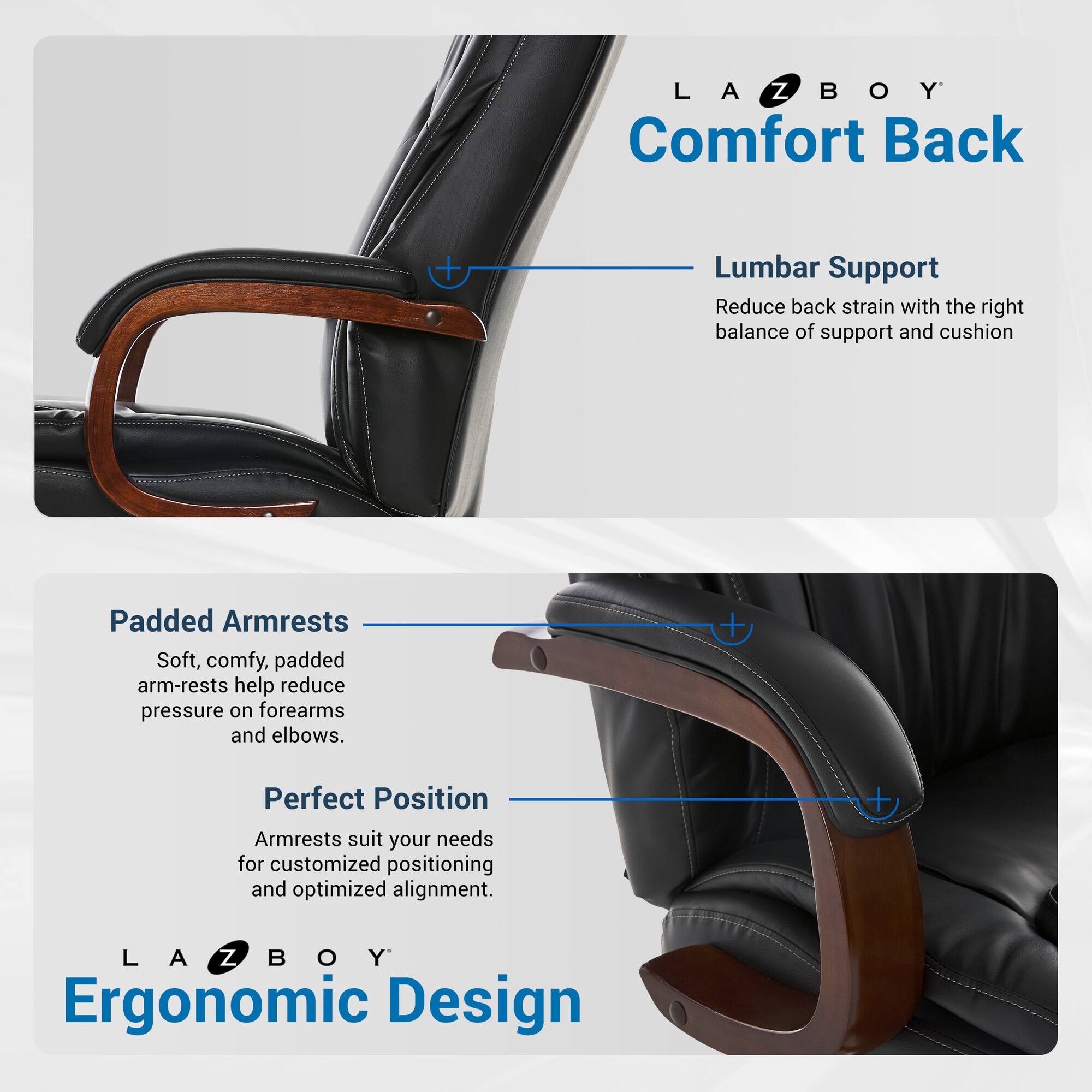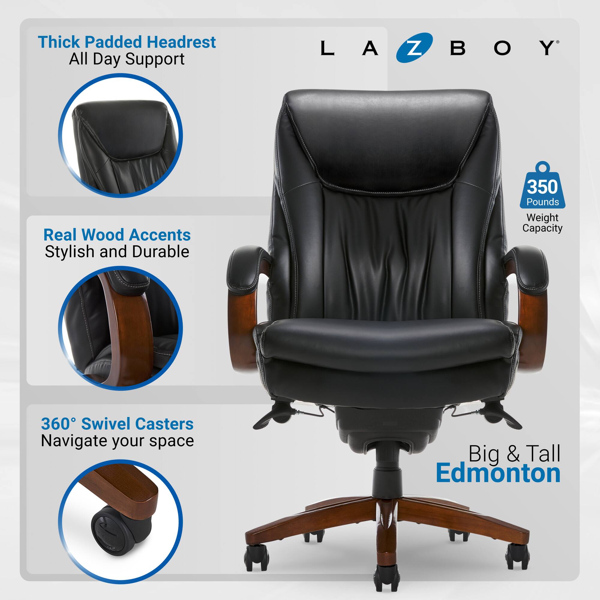 - A:Answer The La-Z-Boy Big and Tall Edmonton Executive Office Chair is designed with features to provide exceptional support and comfort, including adjustable settings for personalized fit and strategically placed pillows to minimize pressure points.