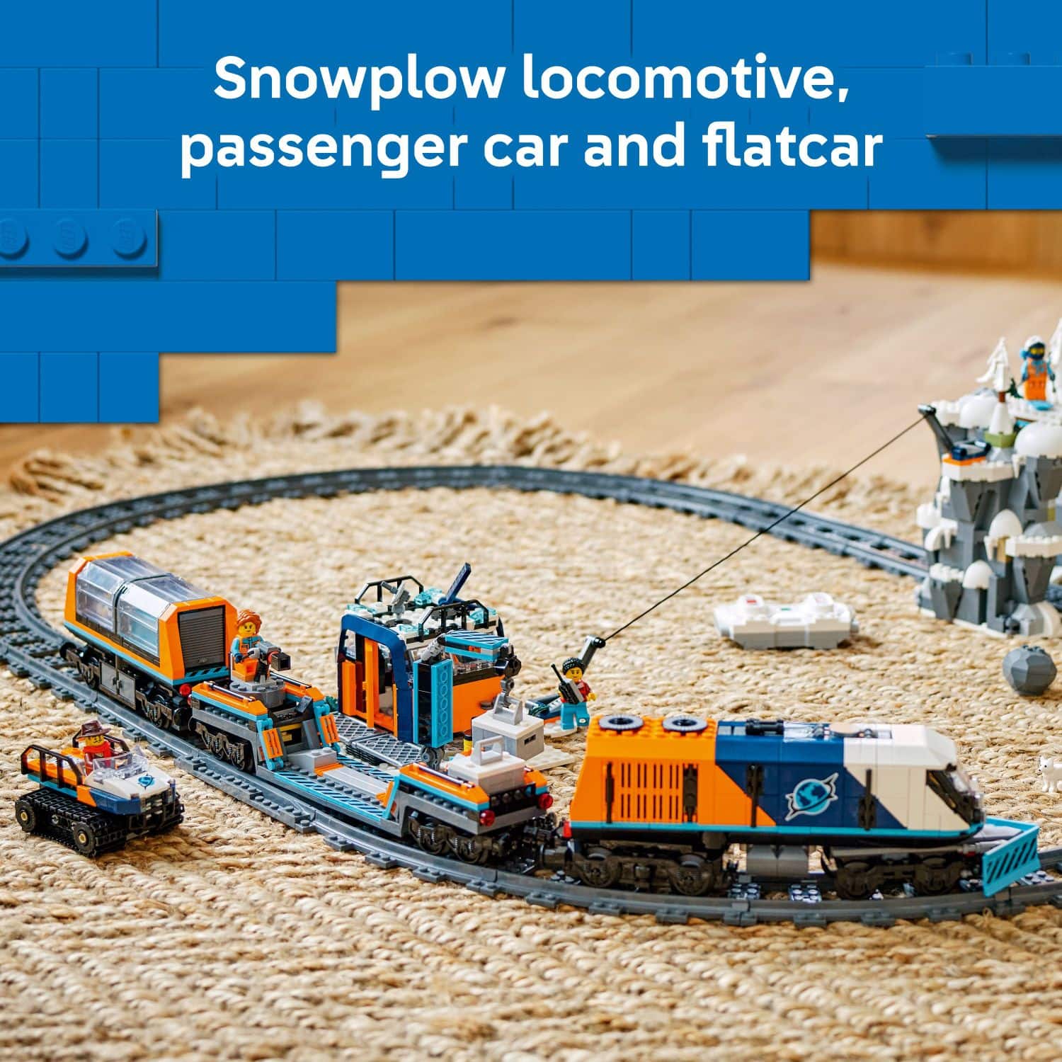 - A:Answer The set includes a motorized locomotive with a snowplow, a panoramic passenger car, a flatcar, and a snow tractor.