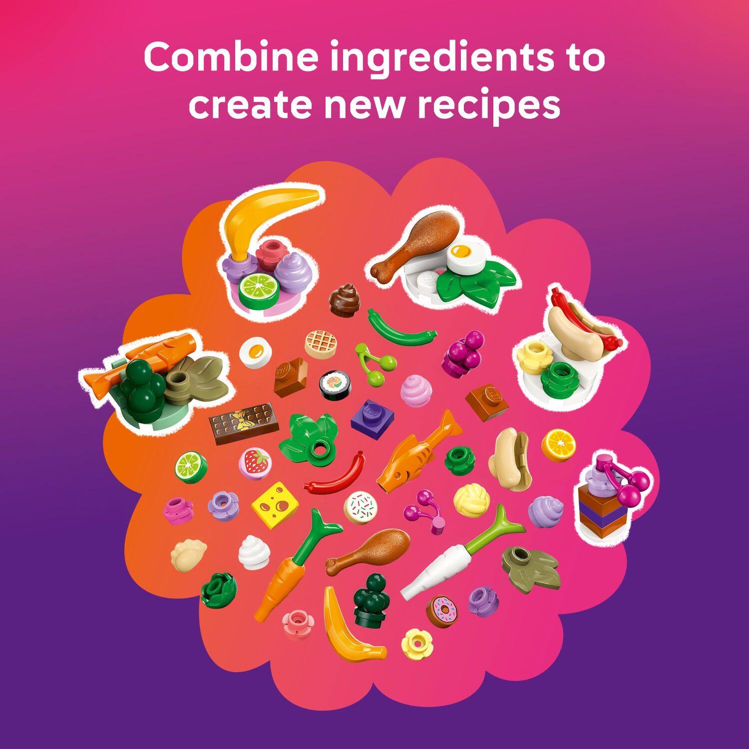 - A:Answer This LEGO set comes with ingredient accessories for kids to make and combine as they create their own dishes, and a cooking station with kitchen accessories.