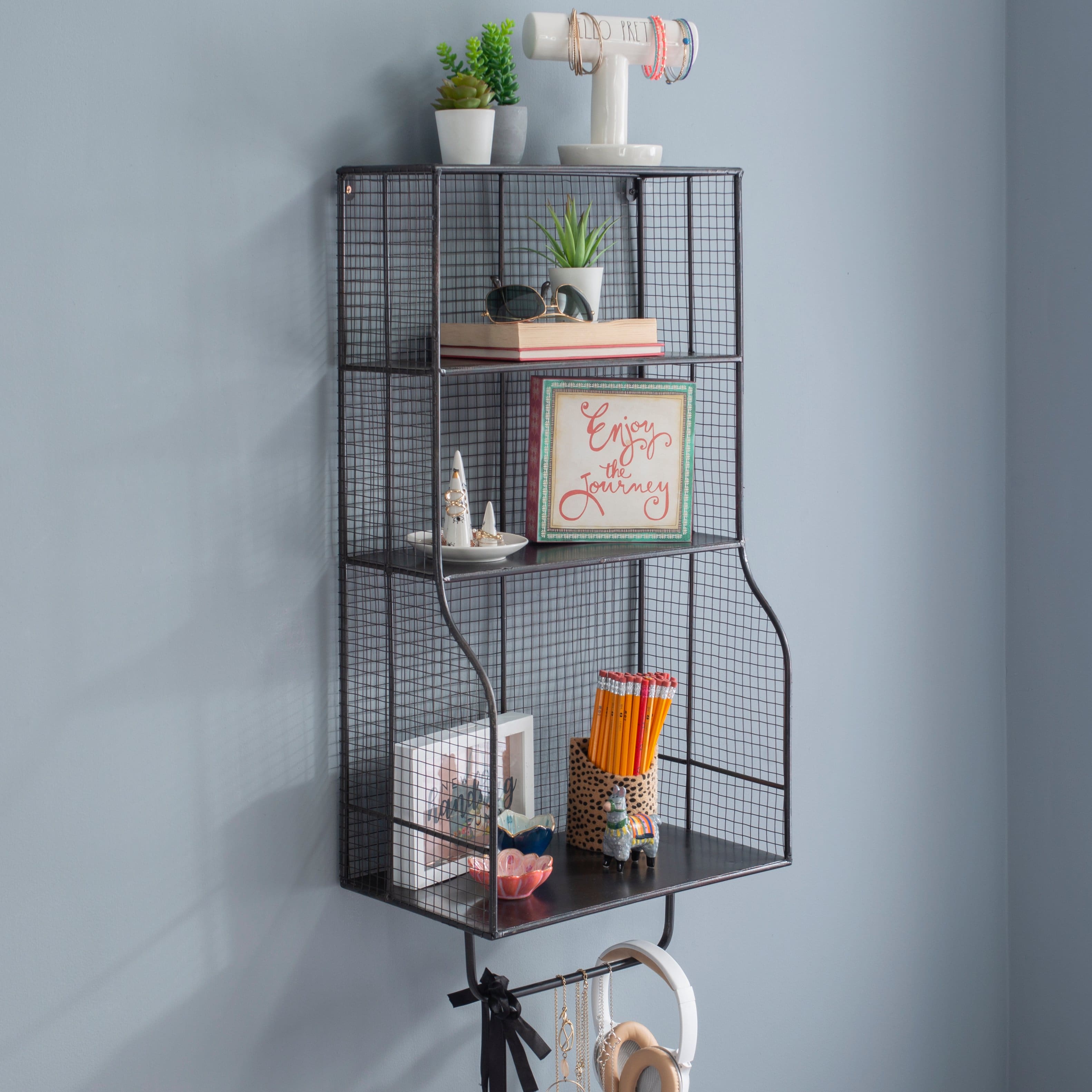 - A:Answer The Grebe 3-Shelf Wall Storage Organizer is 9.65 inches wide, 16.93 inches long, and 34.06 inches high.