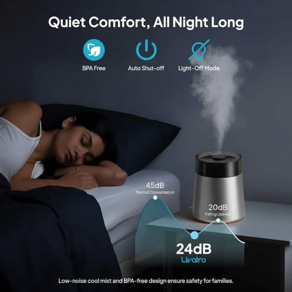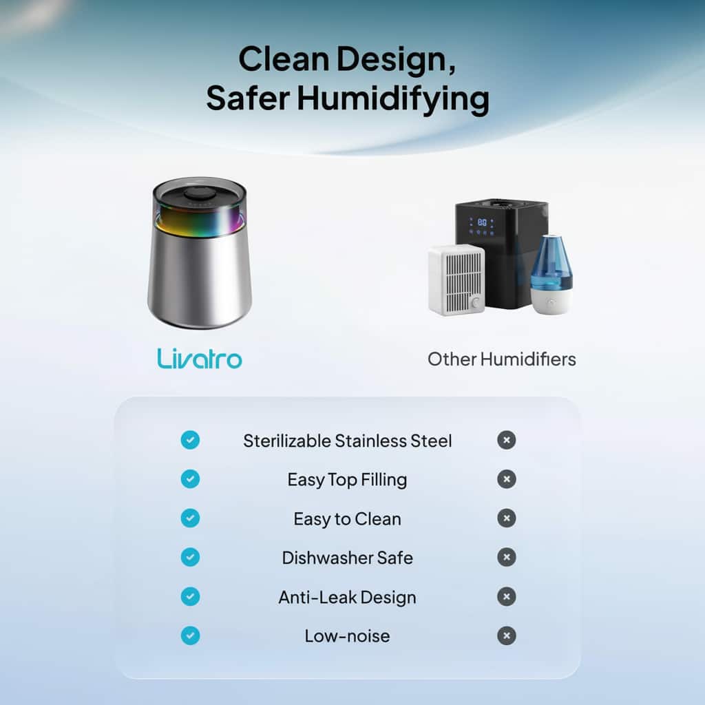 This stainless steel construction resists mold and bacteria growth better than plastic humidifiers, keeping your mist clean and hygienic for daily use.