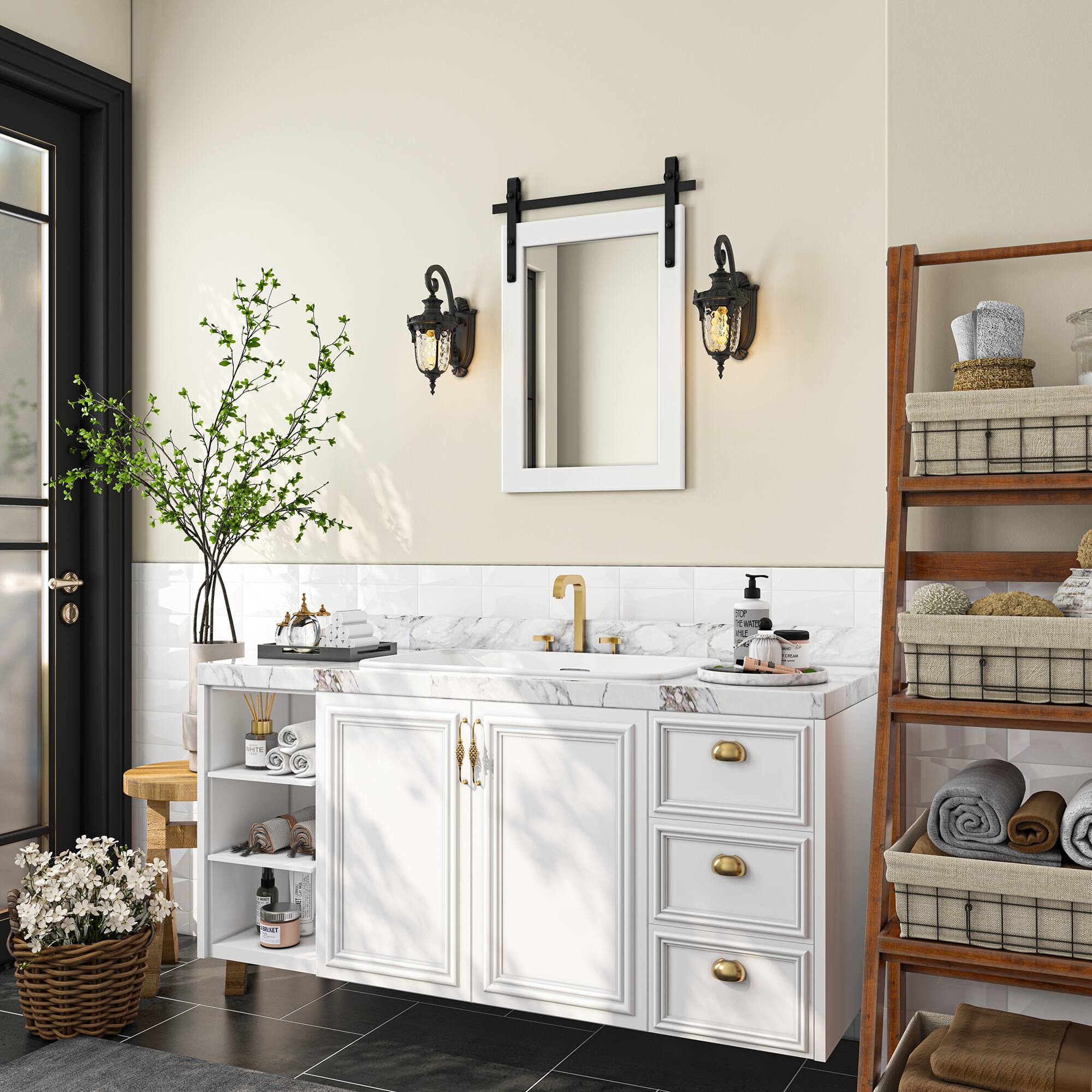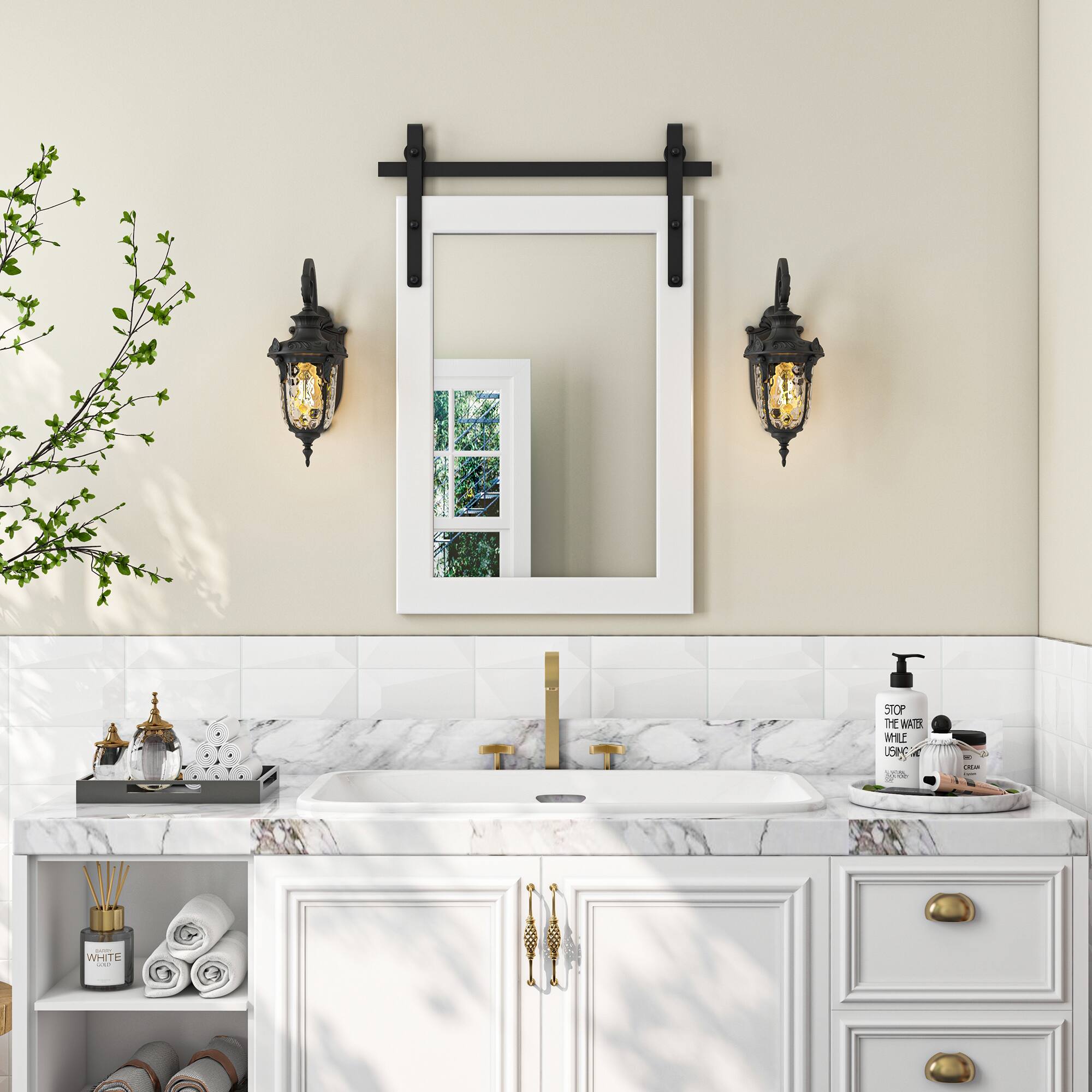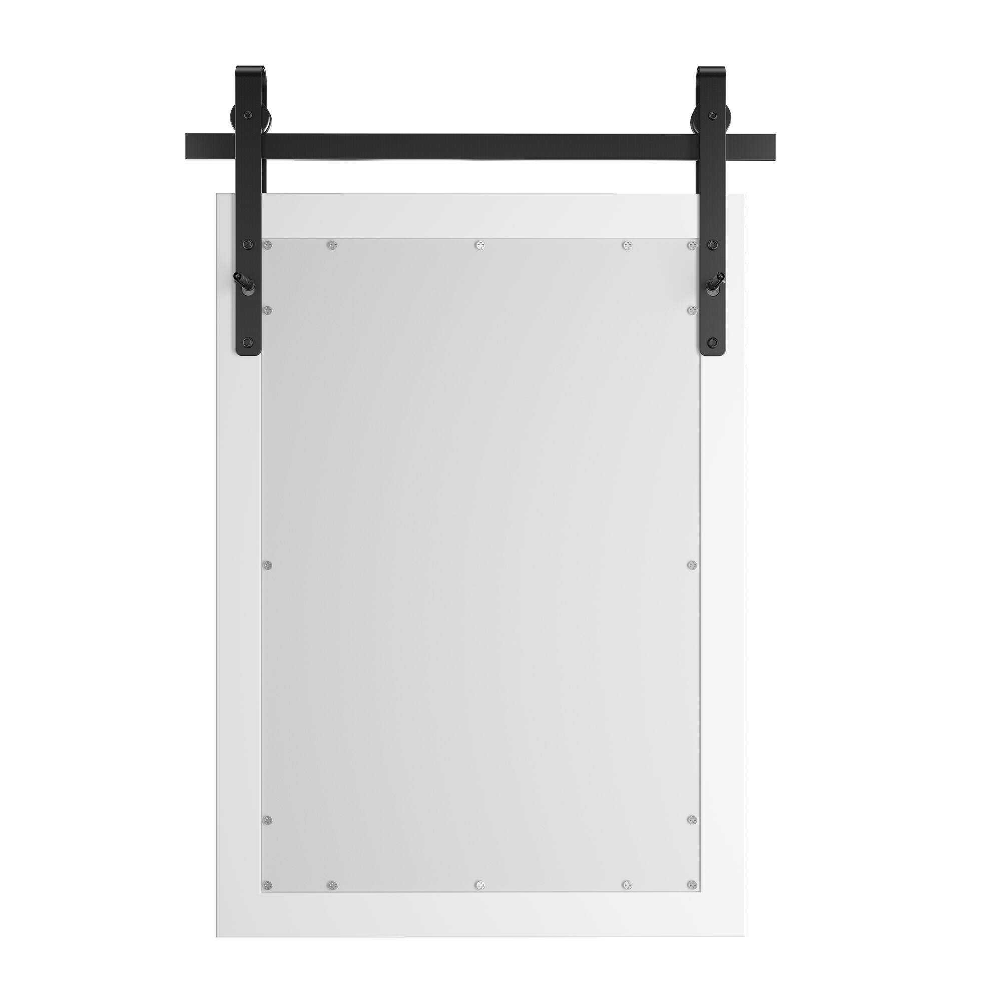 - A:Answer The mirror has a heavy-duty wooden frame designed in a barn door style.
