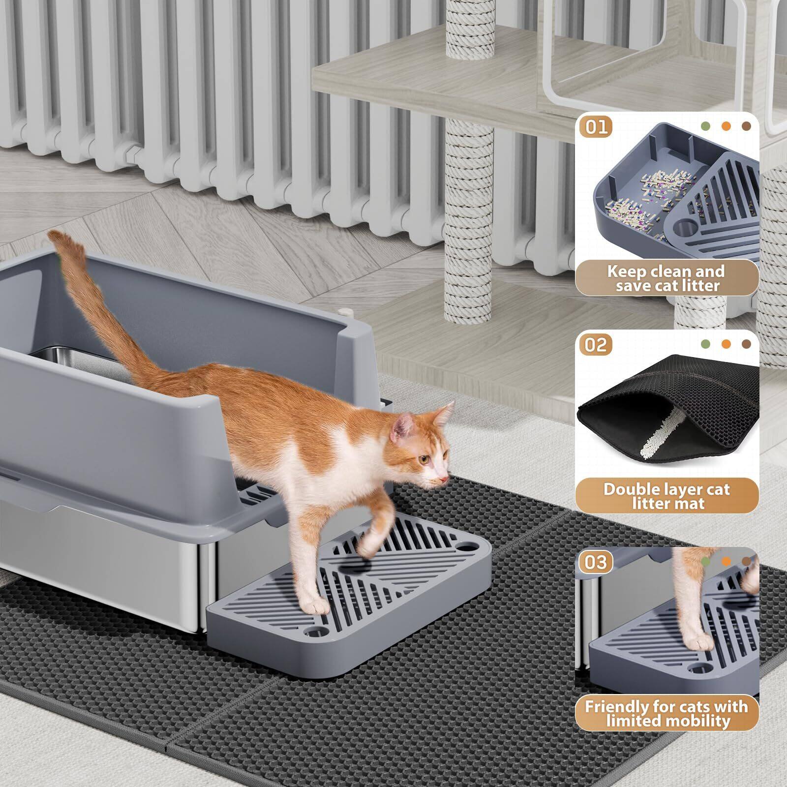 - A:Answer It uses a grid-like mesh foot pedal to collect stray litter from paws and a double-layer litter mat to minimize scatter.