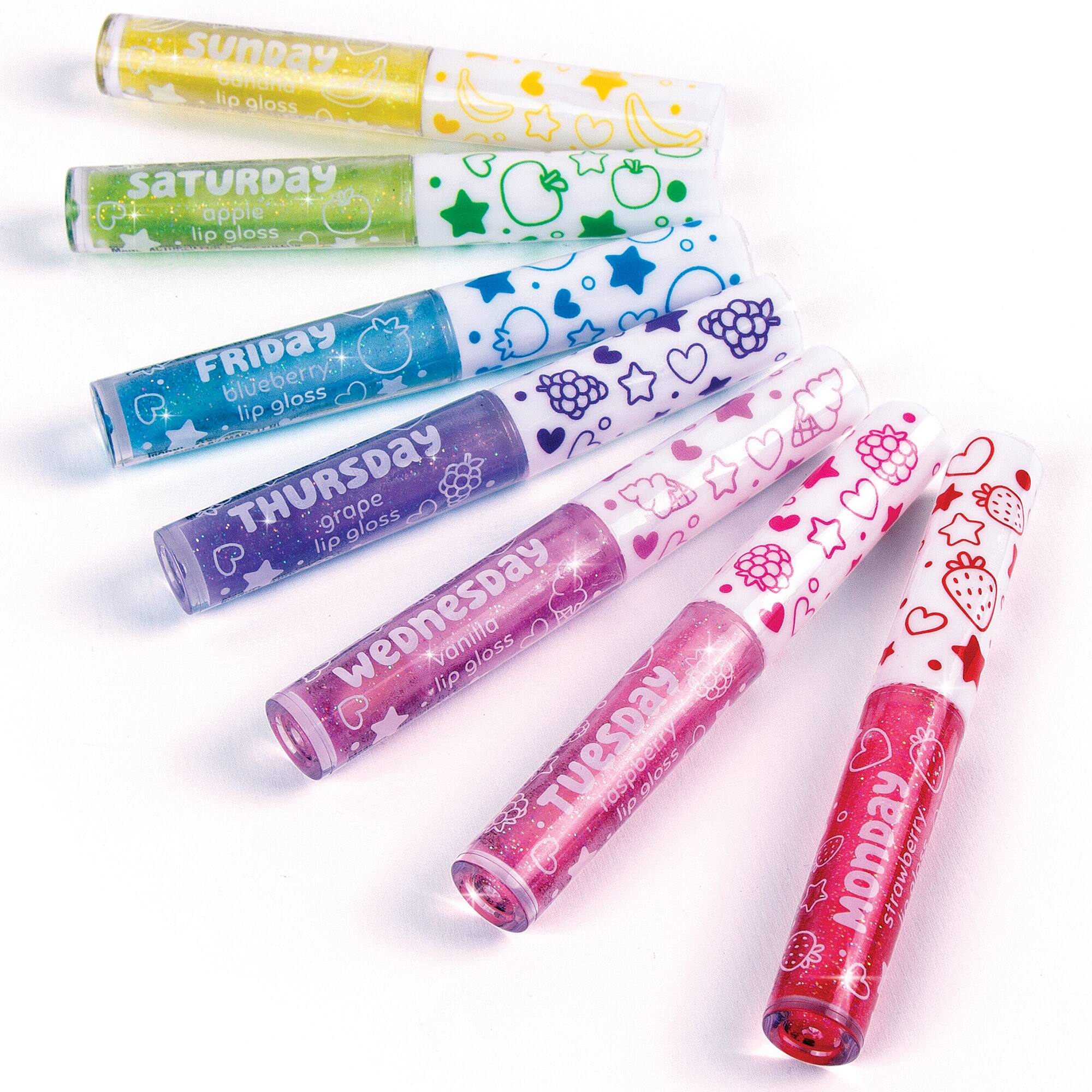 - A:Answer This lip gloss set includes seven different fruit flavors.