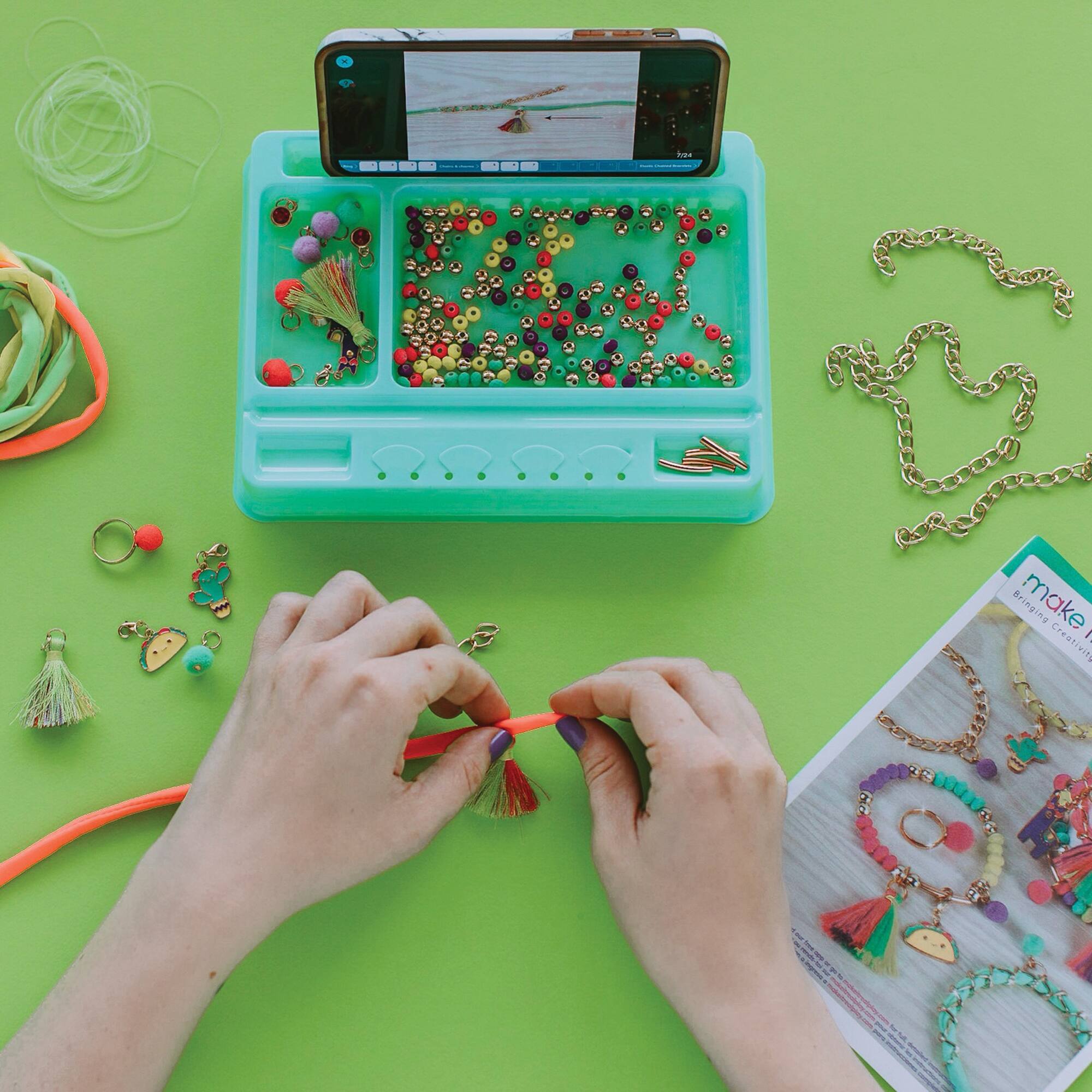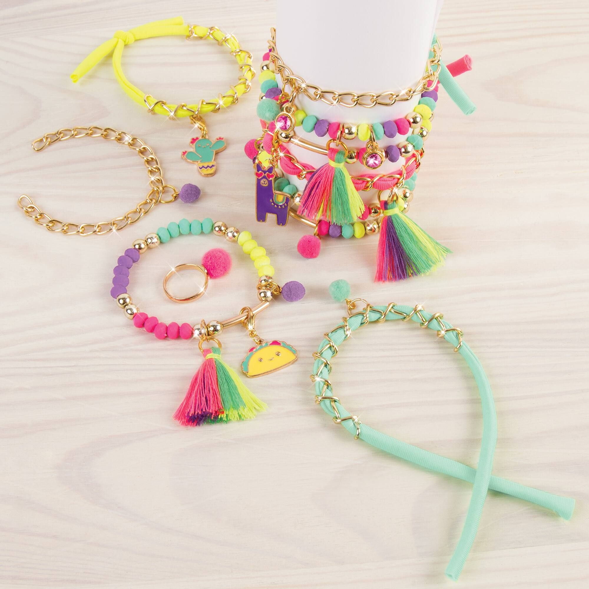 - A:Answer This bracelet kit includes tassel charms, pompom charms, and gem charms.