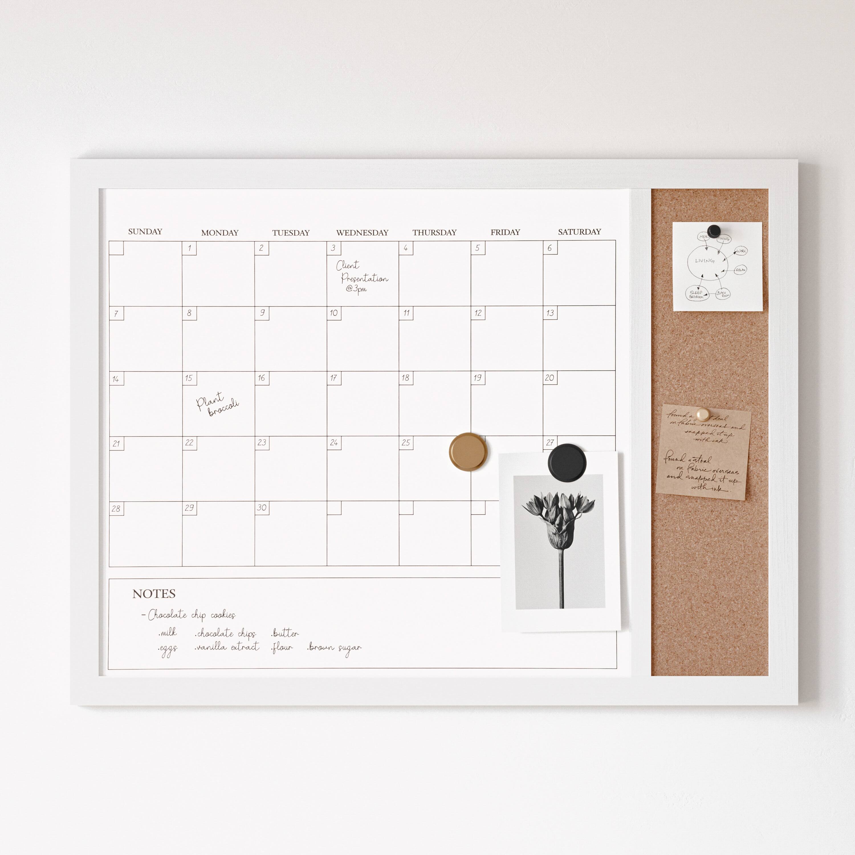 - A:Answer This calendar/cork board features a contemporary design to fit the needs of your space.