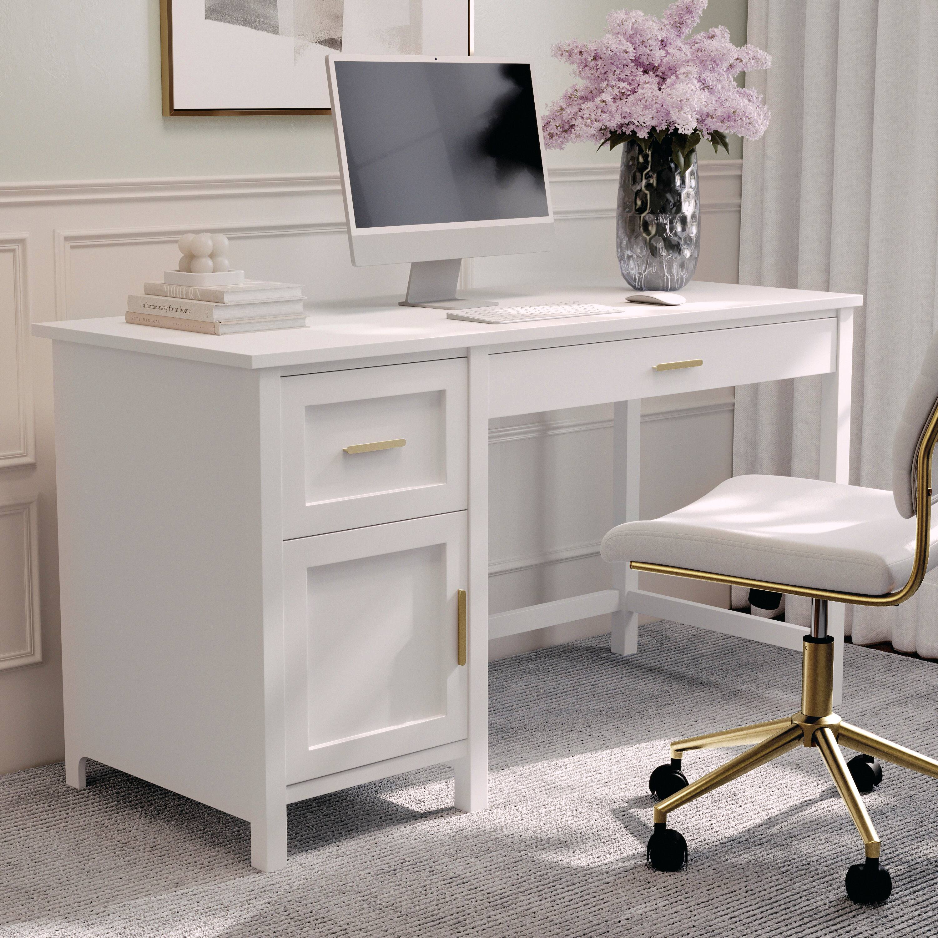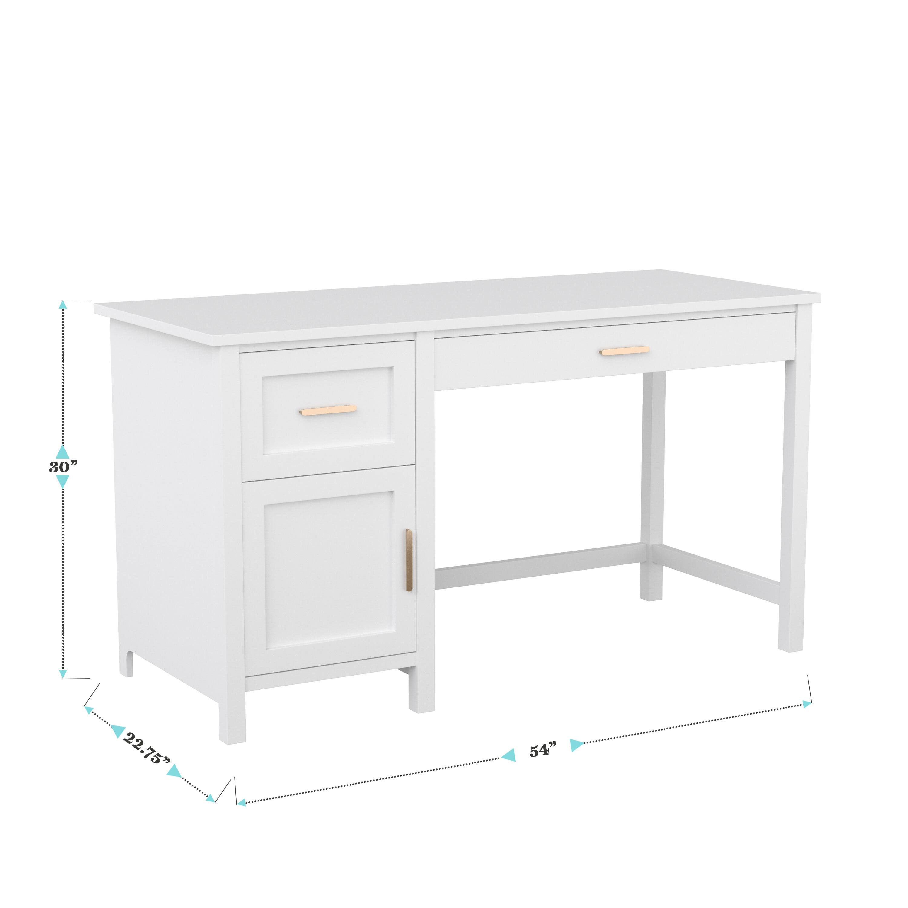 - A:Answer This desk has a top drawer and an integrated storage cabinet with an auxiliary drawer.