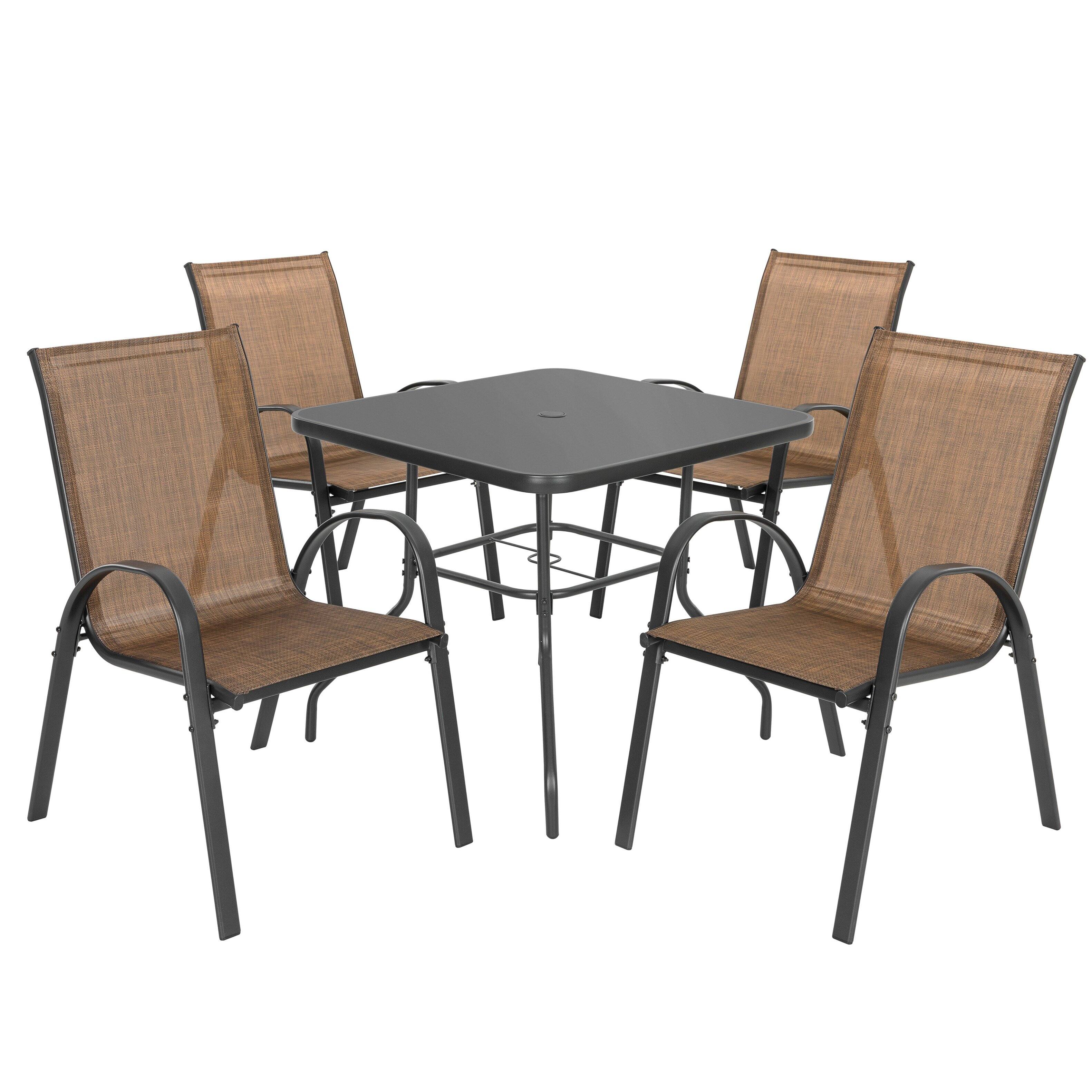 Nuu Garden - 5-Piece Metal and Textilene Outdoor Dining Set, 4 Stackable Chairs and Tempered Glass Table with Umbrella Hole - Black and Brown
