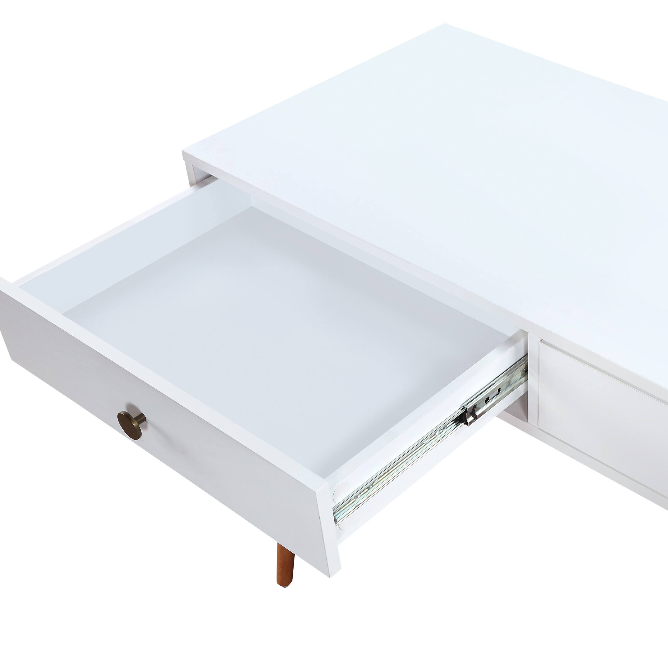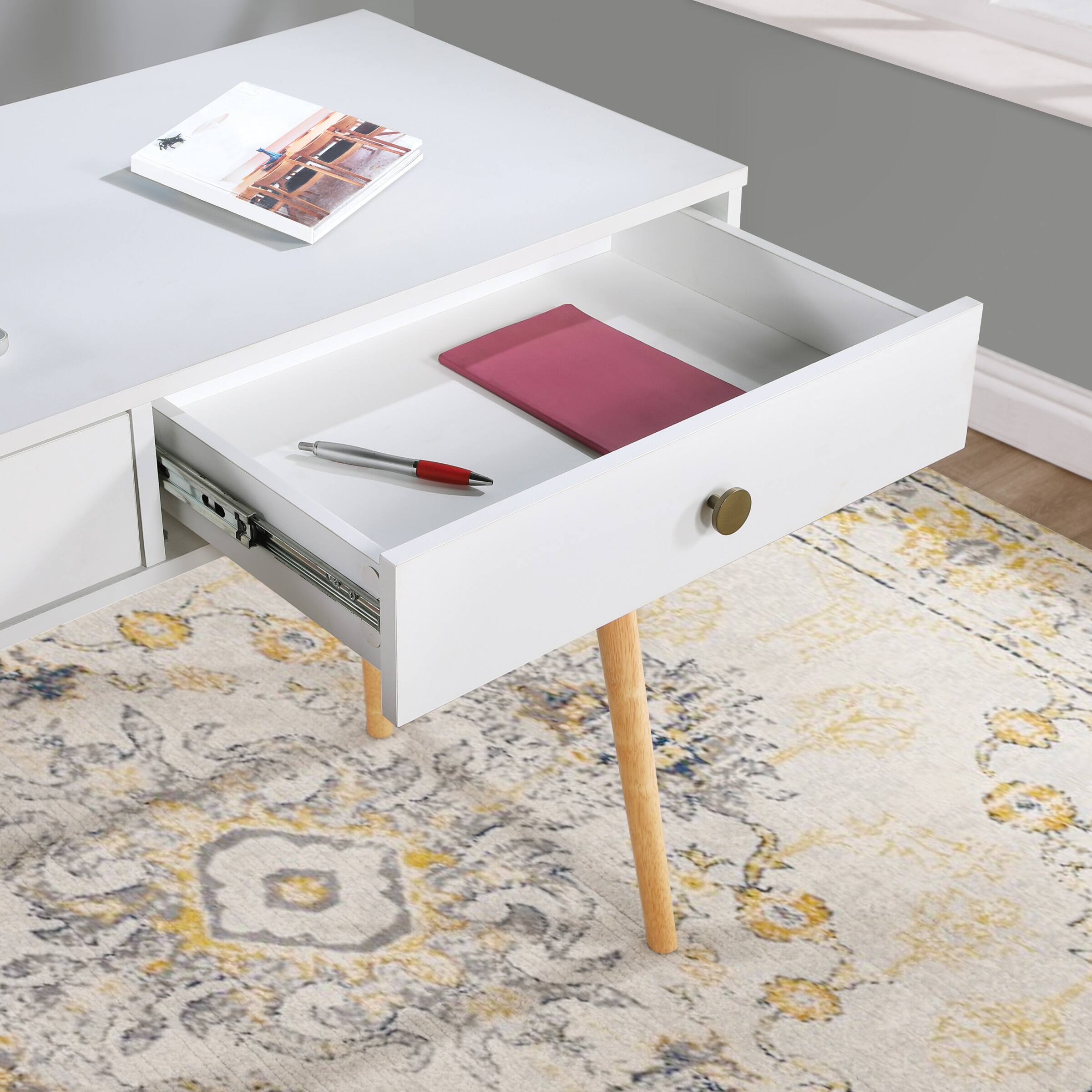 - A:Answer This desk has two drawers that have soft-close ball bearing glides.