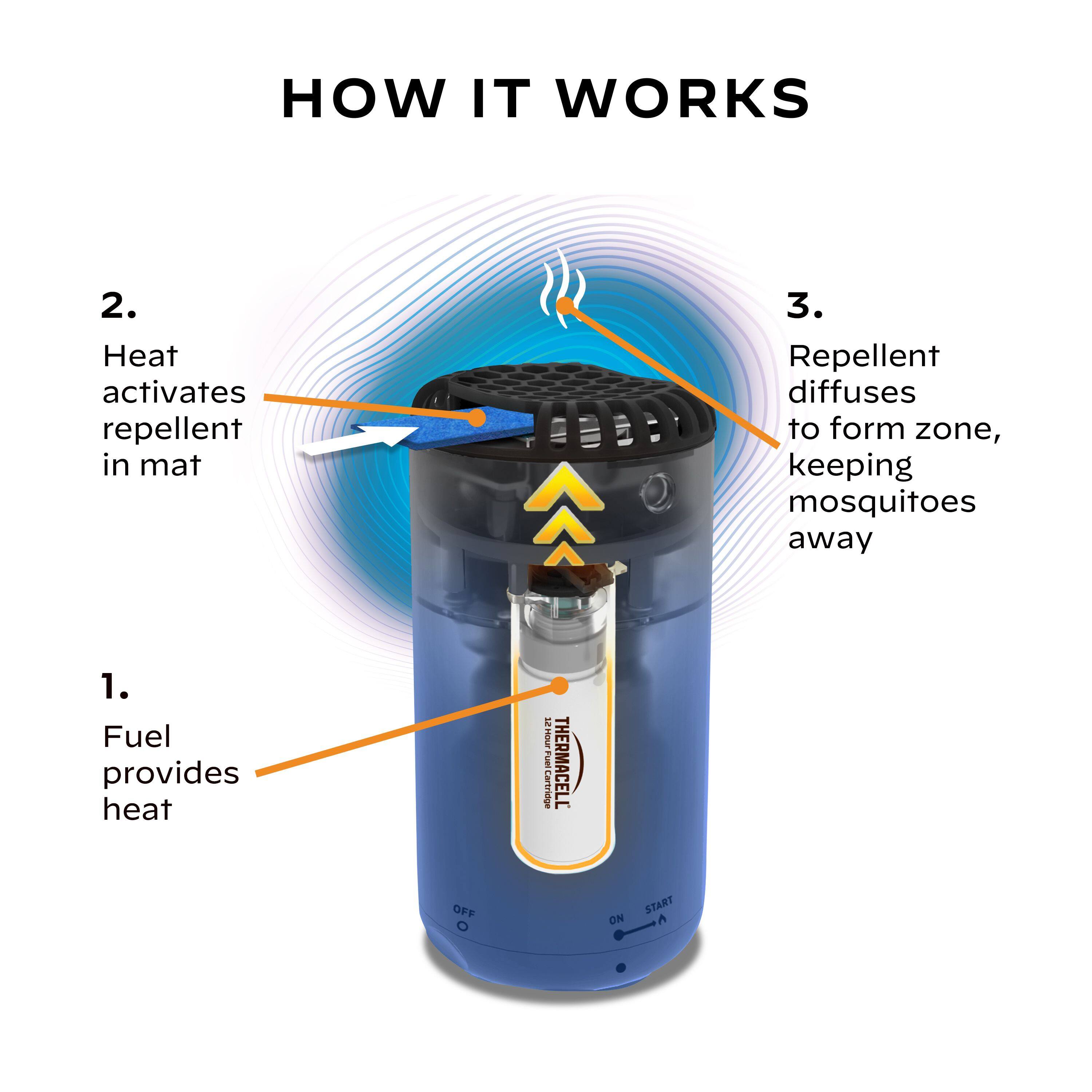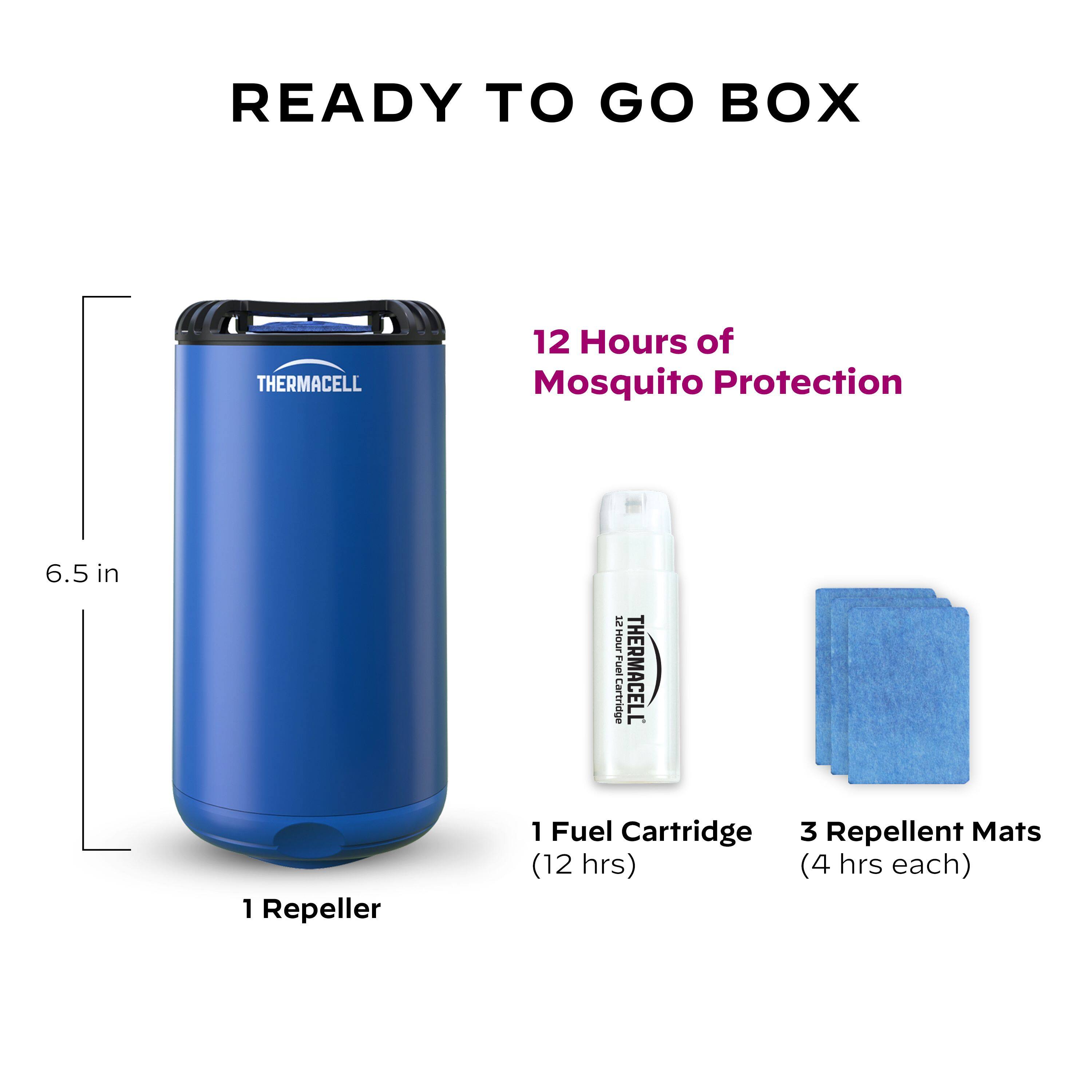 - A:Answer The Thermacell Patio Shield offers 12 hours of mosquito protection, thanks to its fuel cartridge.