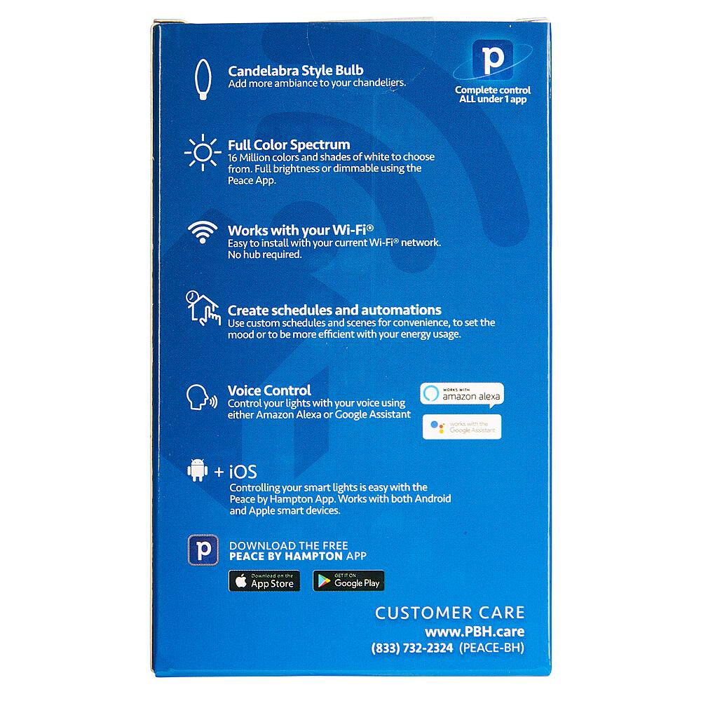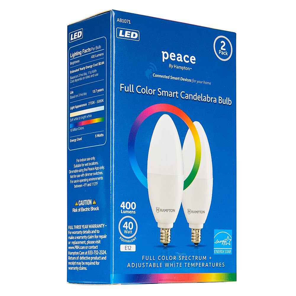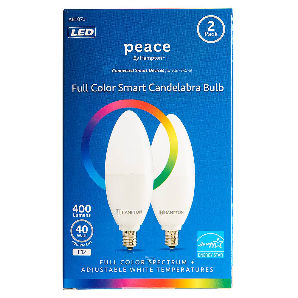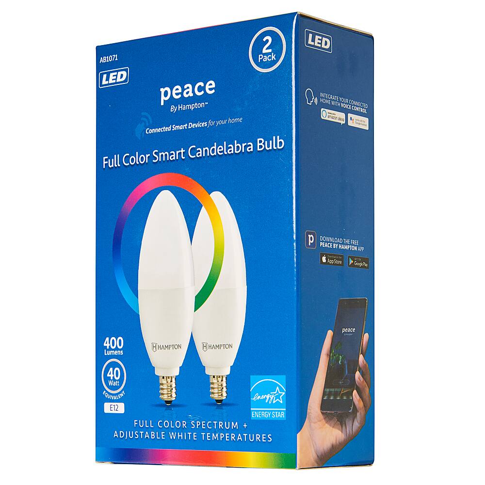 - A:Answer Thank you for your interest in our Peace by Hampton Smart Wi-Fi Full Color LED Candelabra bulb. Delivers 400 lumens of dimmable light. No hub or extra equipment required, connects to your home's Wi-Fi (2.4GHz). Use voice command with Google Assistant and Amazon Alexa.