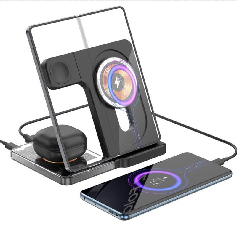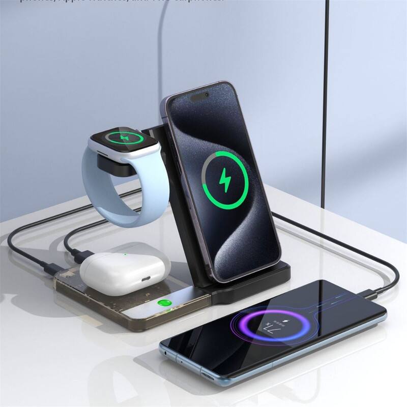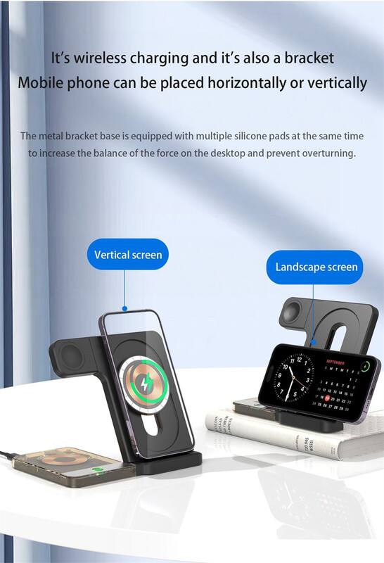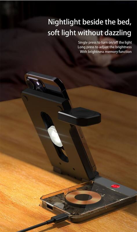 RISOKEYS - Desktop Magnetic 3-in-1 Wireless Charger Stand - Foldable Power Adapter, iWatch 5W Fast Charging with Night Light - Black