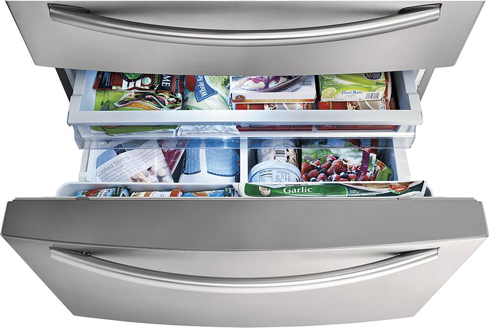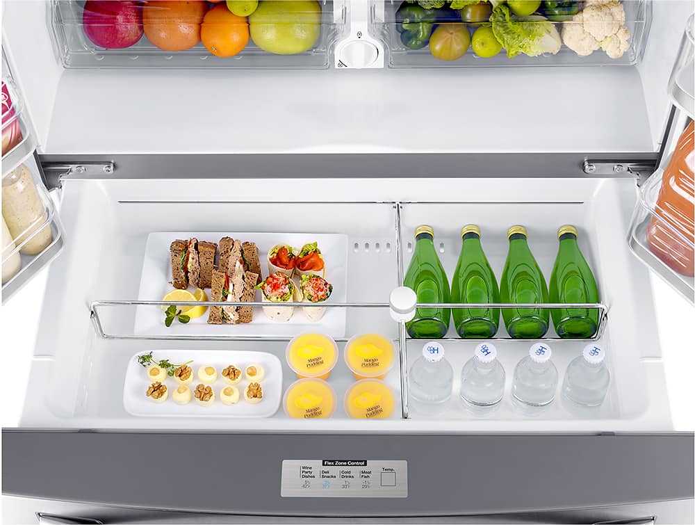 The Cool Select Pantry is a feature in the RFG297HDRS and several other 3-Door French Door models. This independently-controlled drawer within the fridge compartment has 3 settings: Deli, Fresh and Chilled. The Flex Zone Drawer in the 4-Door model has 4 settings (Meat/Fish mode, Cold Drinks, Deli/Snack or Wine/Party Dishes), and can be accessed without having to open the fridge conserving energy and making it convenient for both adults and kids.
