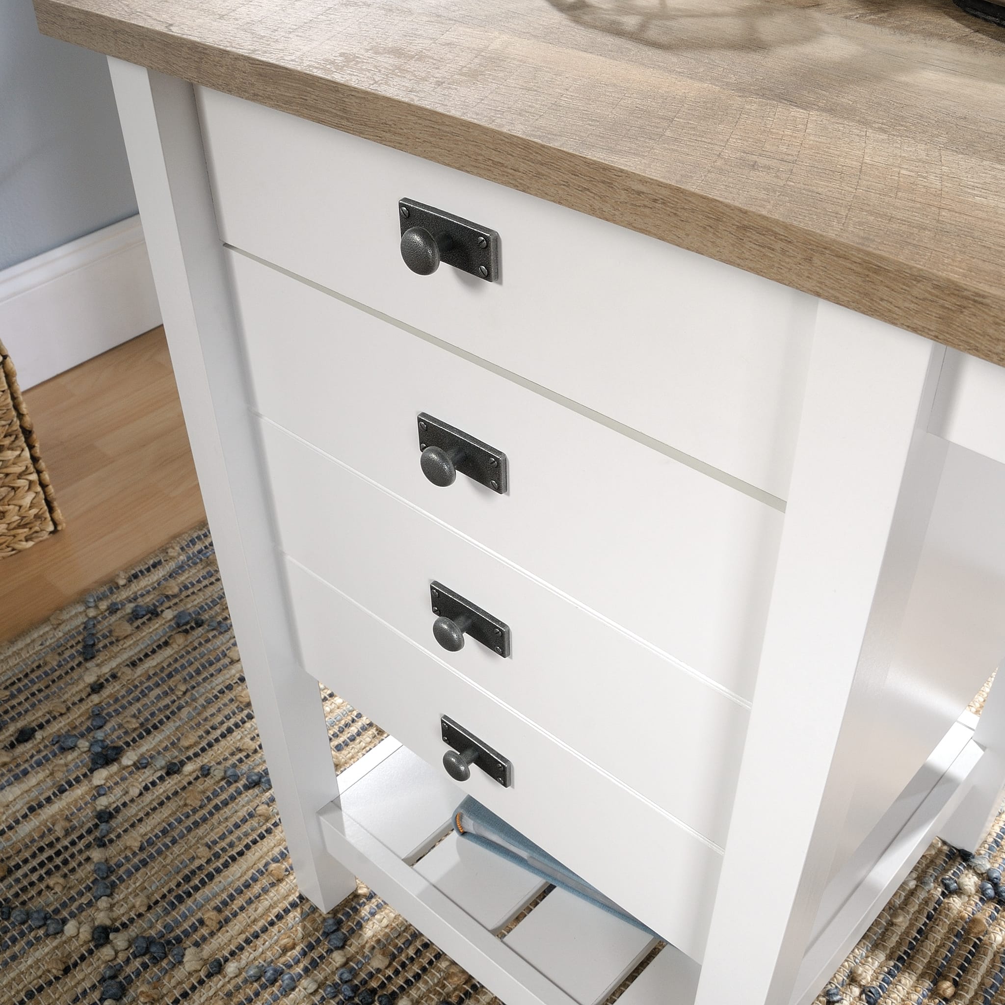 - A:Answer The Sauder Cottage Road Desk is 47 1/8" wide, 19 1/2" deep, and 29 3/4" high.